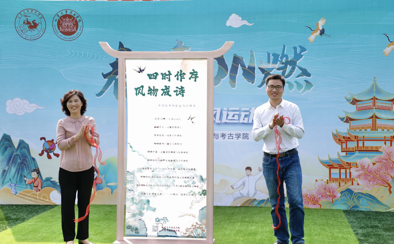 刘军与历史学院档案学系主任、2021级档案班班主任陈建共同为中华优秀传统文化弘扬月活动揭幕。