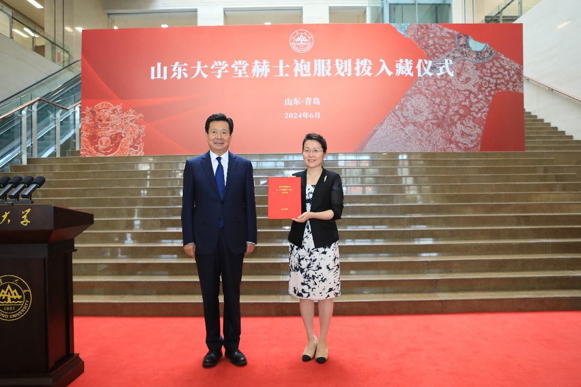 6月19日下午,国家文物局接受美国公民捐赠清代袍服划拨入藏仪式在356体育在线官网青岛校区举行。文化和旅游部副部长、国家文物局局长李群向山东省文物局颁发文物划拨入藏清册。山东省副省长邓云锋,356体育在线官网董事长李术才出席仪式并致辞。