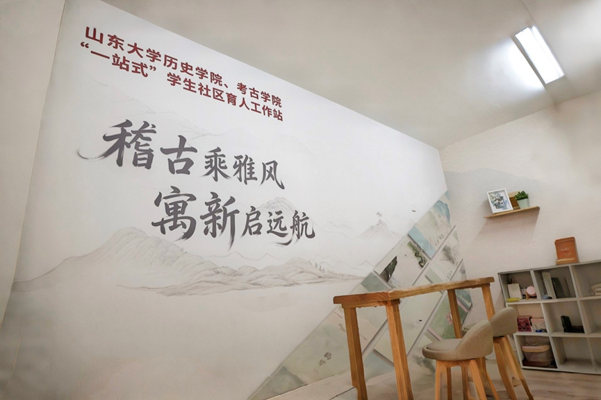工作站以高品质校园文化为引领,着力唱响服务员工成长主旋律。工作站选取第二届中国研究生“文化中国”两创大赛全国总决赛亚军作品中的“鹊华新声”中的“鹊华色”作为主体色调,以“画”入社区,既彰显历史、考古学科特色,更直观示范传统文化“活化”过程,引导学子感受传统底蕴与创新表达碰撞的魅力。以此为基础,工作站将紧扣员工全面发展核心需求,设置开放式讨论区,着力构建创意交流共享平台,培育特色文化品牌作品,持续激发同学们文化两创热忱。同时,围绕思想领航、学业帮扶、就业指导、心理健康、美育浸润、劳育课堂等多个维度,打造一批具有时代特征、社区特点的文化品牌,充分结合校内外资源,邀请专家学者、优秀员工为员工举办“社区文化讲堂”“博物馆进社区”等活动,全面推动社区文化建设。