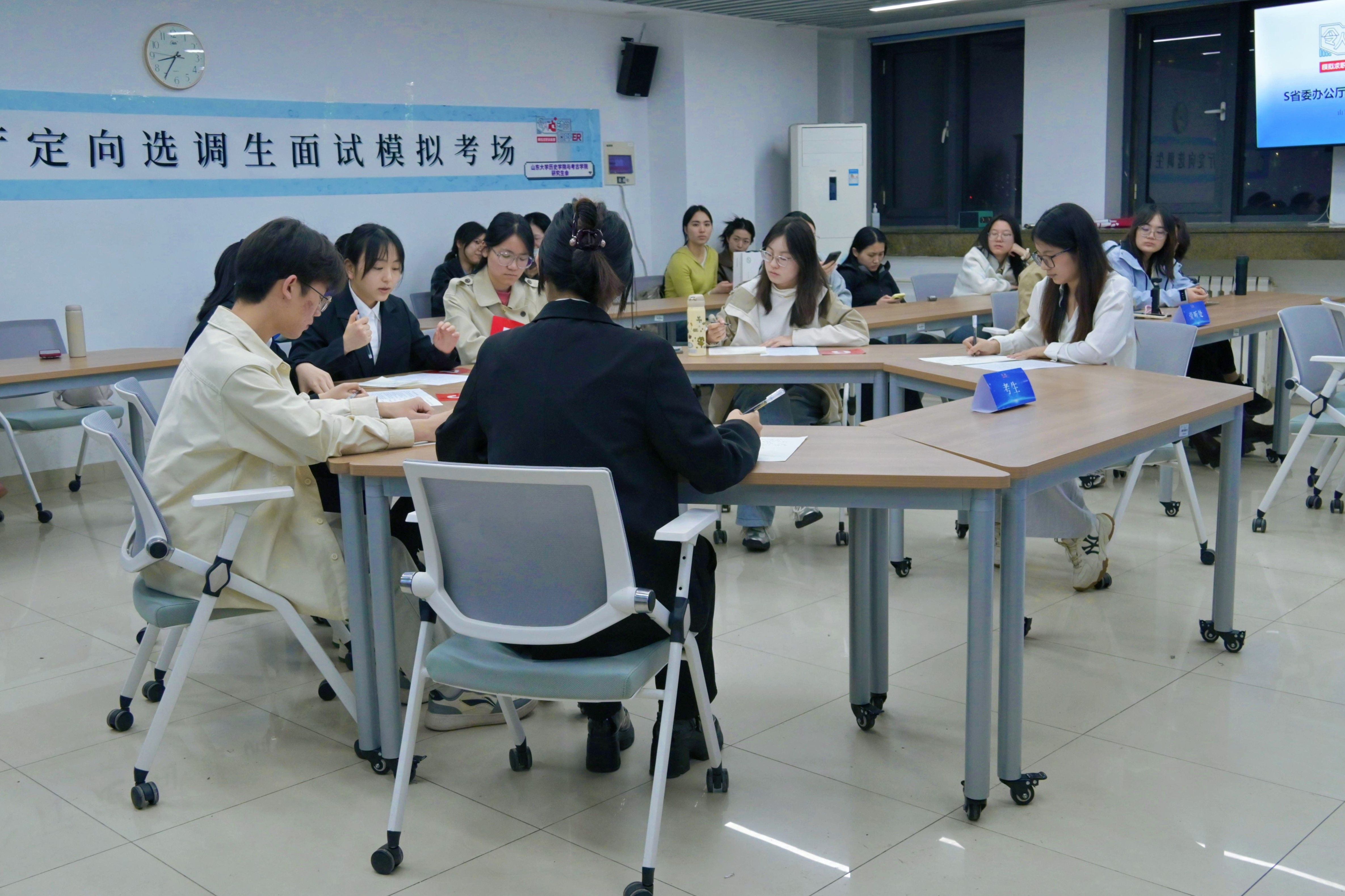 模拟课堂竞逐,锤炼教学本领。“历史教师模拟面试比赛”特邀山大附中资深教师李洁担任评委,重点测评考生的历史学科知识与教学能力、课堂驾驭及语言表达等综合素养。比赛严格参照教师招聘流程,选手利用30分钟独立备课,撰写简要教案。随后进入模拟面试环节,分为说课与综合素质答辩两部分。每位考生面试结束后,李洁从教材处理、教态语言、板书设计、时间分配等维度进行针对性点评,并结合一线教学经验,给出了具体改进建议。比赛为有志于从事历史教育的同学提供了宝贵的实战演练平台,有效提升了大家的应试信心与教学实操能力。