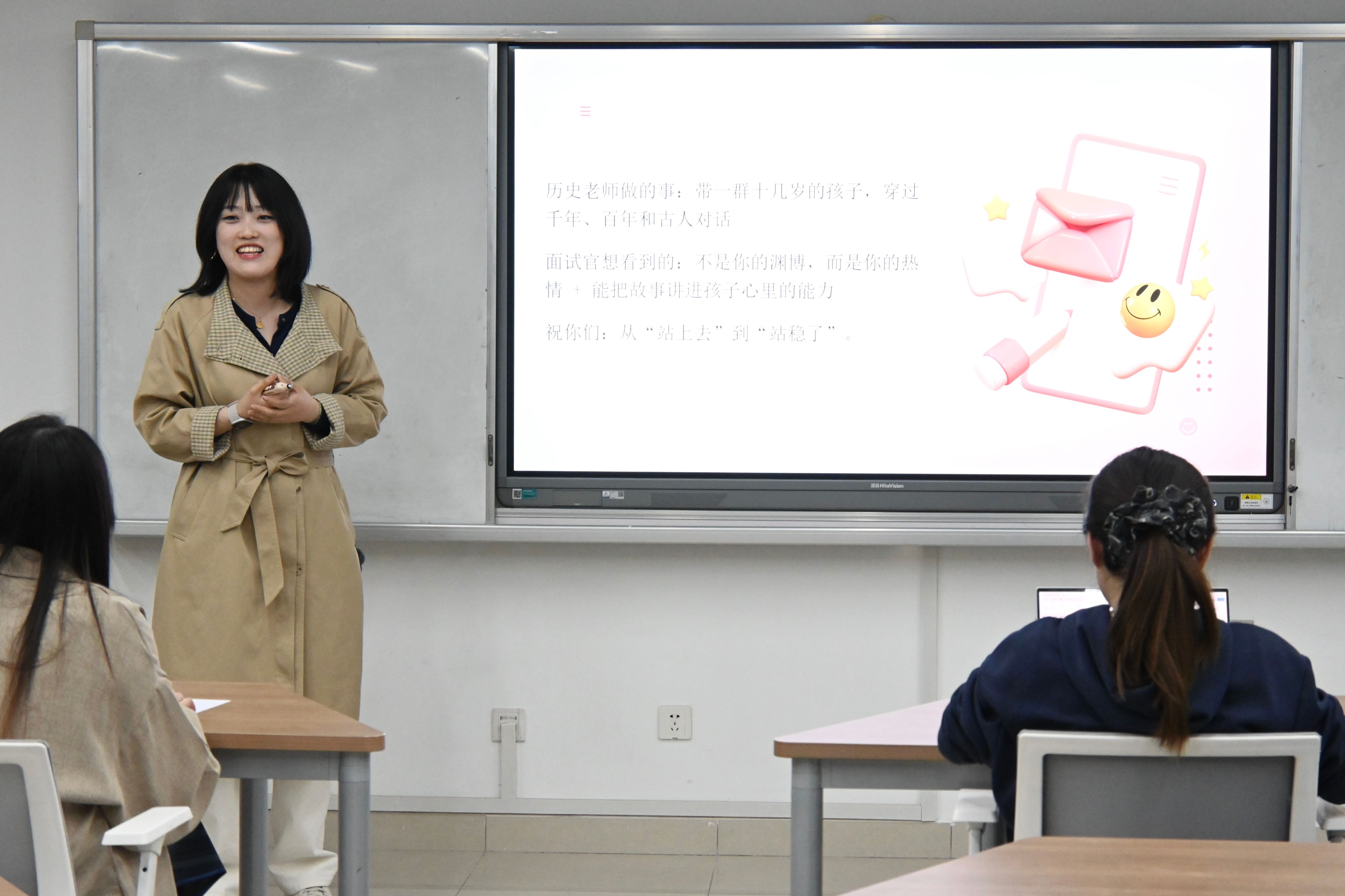 教师技能精讲,明晰执教路径。教师讲课培训系列讲座邀请山大附中许欣楠、张馨月两位老师主讲。她们结合从员工到教师的身份转变,分享了一线教学体验,帮助同学们建立对教师职业的立体认知。针对试讲环节,她们重点拆解了教材重难点把握、教学流程设计等核心要素,强调试讲是对语言表达、板书、教态等综合素养的检验。随后开展了教师编模拟面试,严格按流程进行10分钟无生试讲。两位学姐担任面试官,从教学内容、方法运用、时间把控等维度逐一点评。她们既肯定了同学们思路清晰、教态自然等亮点,也指出重难点不突出、互动设计不足等问题,帮助大家找准提升方向。