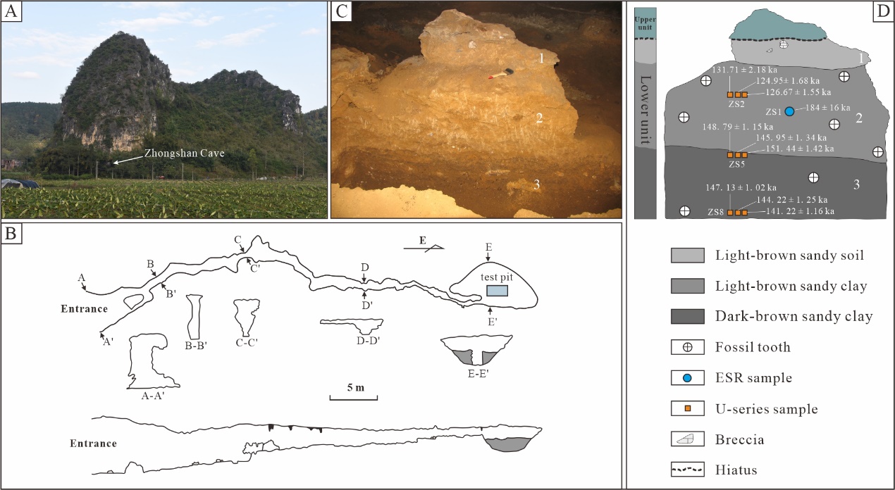 研究团队对广西田东中山洞发现的113枚猩猩化石开展了详细的研究,通过与化石猩猩和现生猩猩标本进行形态对比,发现中山洞的猩猩牙齿化石尺寸在整体上比中国南方其它遗址出土的猩猩牙齿化石小,代表了已知中国南方最小的猩猩化石记录。此外,中山洞的猩猩牙齿化石表现出门齿齿带发育、上颌臼齿齿带残留频率中等、上颌和下颌臼齿釉质褶皱显著等特征,与猩猩魏氏亚种Pongo weidenreichi差异显著,属于已经灭绝的Pongodevosi。研究团队采用多接收器电感耦合等离子体质谱(MC-ICP-MS)同位素分析技术和电子自旋共振与铀系联合法测定地层中的哺乳动物牙齿化石,将中山洞猩猩化石的年代合理地限定在距今18.4万年前。研究结果证实了一个小型的物种P.devosi在中更新世晚期取代了猩猩魏氏亚种P. weidenreichi。这项发现将P. devosi最早出现在中国南方和东南亚大陆的时间向前推进至中更新世晚期。另外,中山洞猩猩牙齿化石提供了新的重要的证据,证明华南地区猩猩的牙齿形态特征在中更新世晚期发生了重大变化。这项发现和研究为探索东亚大型猿类的起源与演化提供了重要的科学依据。
