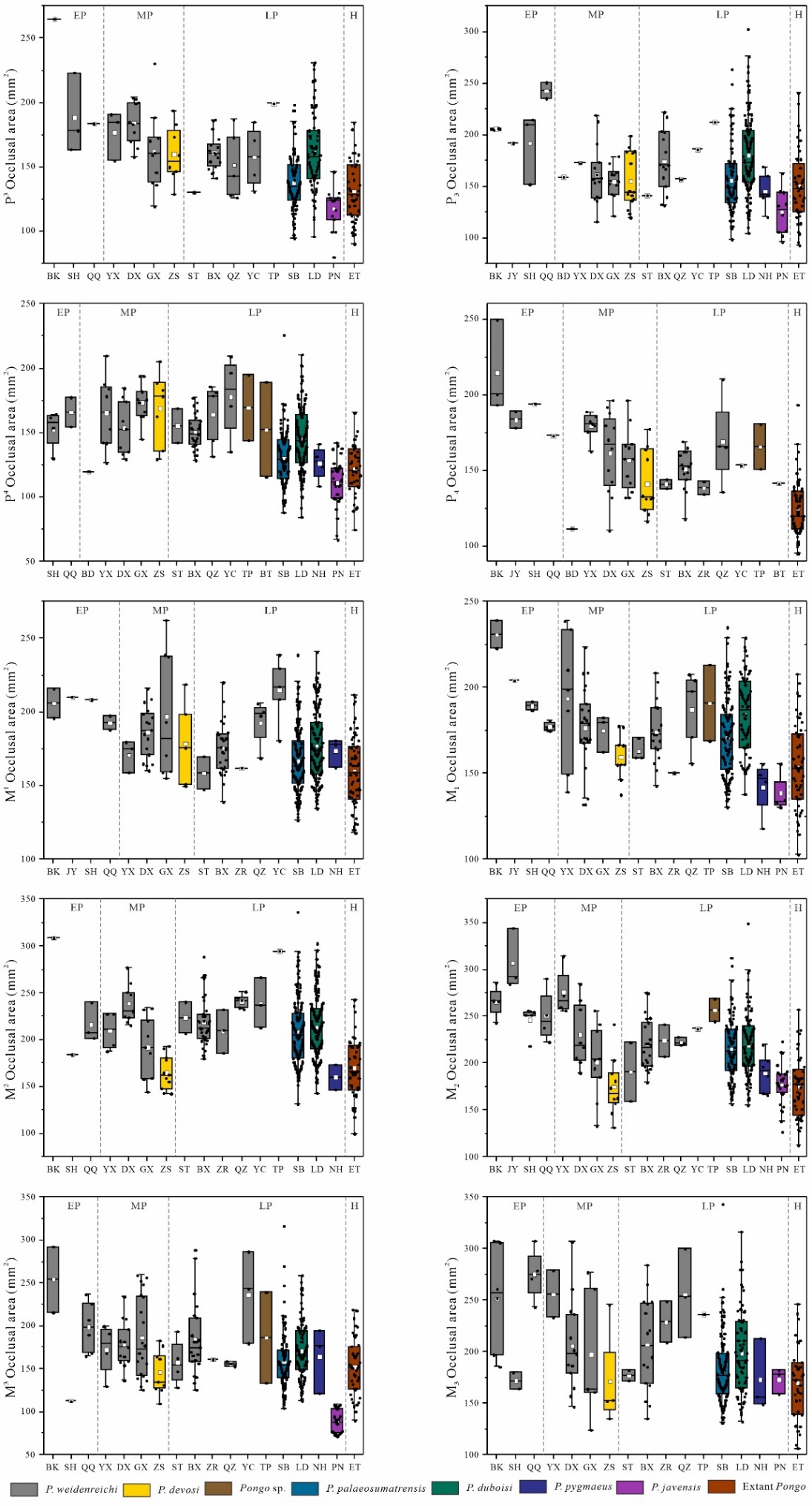 图3中山洞遗址猩猩牙齿化石的尺寸比较