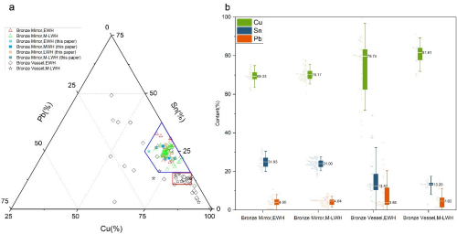 此外,研究还采用了特征参数法和核密度估计法以避免铅同位素比值的重叠效应。研究表明,虽然某些铜镜的铅来源很可能是山东本地,但其他铜镜的铅可能来自更遥远的小秦岭矿区——靠近首都长安,方便汉帝国的直接控制。这种在铅同位素研究中减轻重叠效应以便更好地确定矿料来源的方法,作为一种研究工具,在铅同位素示踪方面将具有广阔的应用前景。