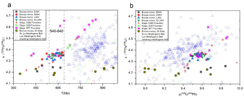 一个非常有趣的发现是,不同墓向的墓葬出土铜镜的铅料来源不同,这可能是因为随着新的封建国家的建立,新移民进入了不同的文化社区,这些新移民可能在墓葬朝向和产品类型方面有着不同于土著人口的文化偏好。这一研究思路表明,铅同位素比值的用途远不止确定矿石来源这么简单,而是可以与更深层次的社会、文化、政治和经济研究联系起来,有助于解释相关考古研究问题。