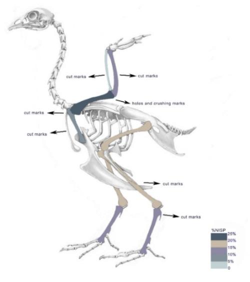 图二小高遗址雉遗存的骨骼单元分布和人工痕迹位置示意图