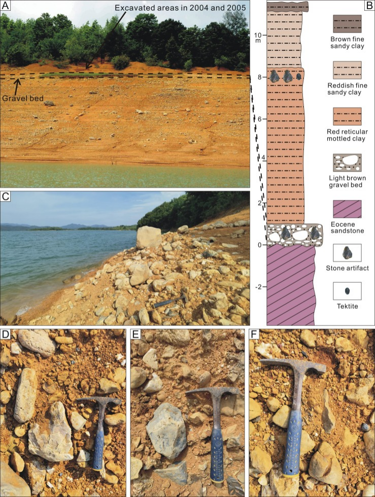 百色盆地阿舍利石器组合自发现以来就受到了学界的广泛关注,经历了近30年的研究,已经获得了丰硕的研究成果。但是,长期以来,百色盆地阿舍利石制品被认为均出土于盆地内的第四级阶地上部的网纹红土层内,而其年龄的限定则依赖于跟石制品同层玻璃陨石的年代测定。因此,百色阿舍利石制品的年代被认为均处于距今80万年左右。但这是否代表了百色盆地阿舍利人群最早的出现时间,目前仍不清楚。新的更早层位石制品的发现将有利于明确和建立百色盆地阿舍利人群出现和演化的时间框架。