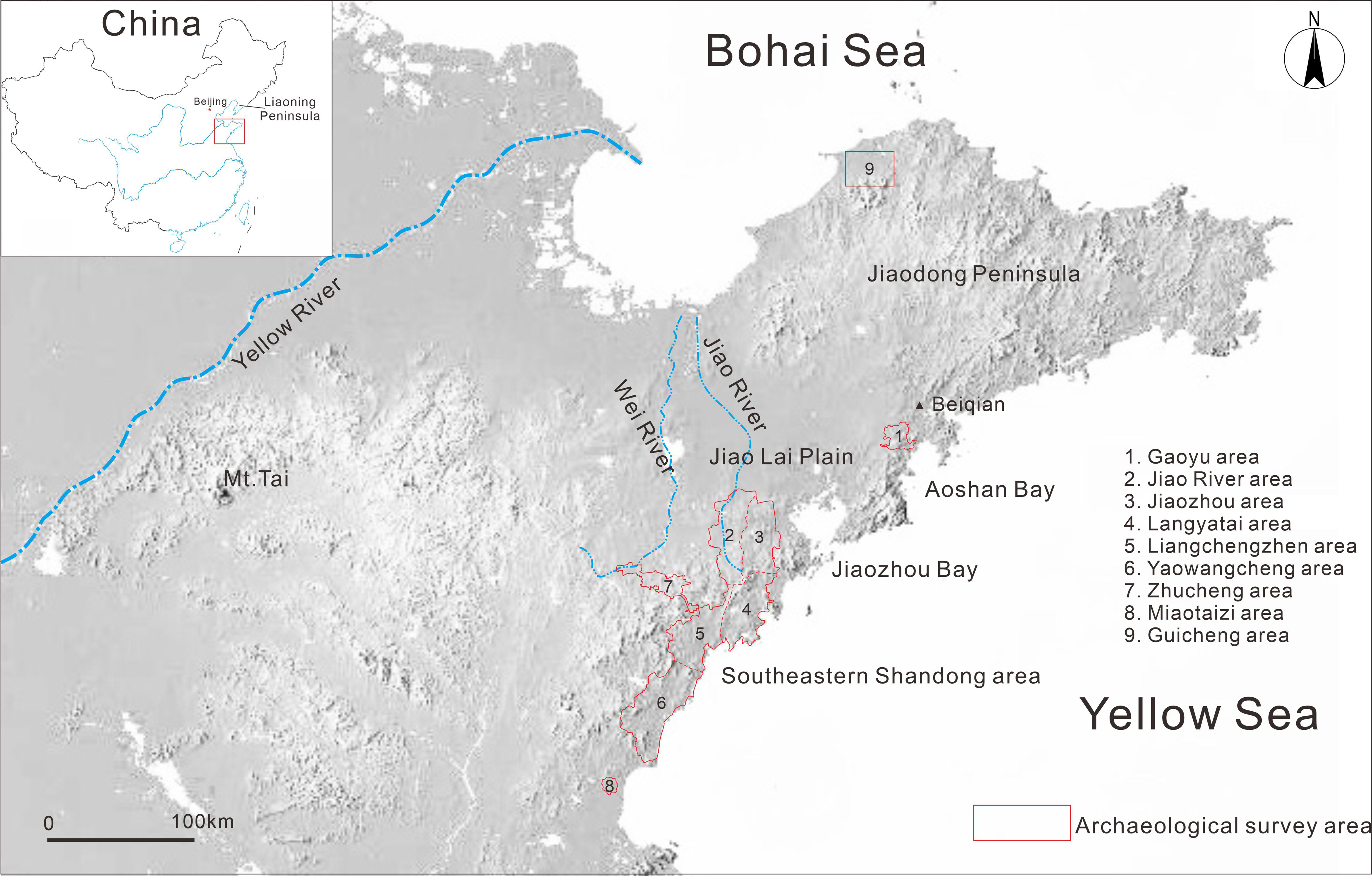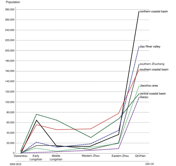 本项研究结合近年来项目团队在潍河上游地区、胶东半岛南部等鲁东南邻近或周边区域所进行的扩展调查的新发现,对调查区域内社会发展的路径和模式提出了新见解。文章认为,从长时段视角看,邻近地区的人口和社会演化模式与沿海地区并不同步,当沿海地区龙山时期人口和社会复杂程度达到高峰时,周边地区(包括潍河上游地区、胶河流域、胶东半岛南部等)并没有出现如两城镇、尧王城遗址所代表的规模庞大且层级分明的社会组织,这表明沿海地区的社会网络体系主要沿海岸线大致呈南北走向延伸,与胶河、潍河流域的联系因受到五莲山脉的地理阻隔而明显减弱。两周时期,来自山东西部内地的政治扩张改变了沿海地区乃至整个山东东部的发展轨迹,靠近内陆的胶河、潍河流域东西向交流畅通无阻,因而更容易受到来自西部内地的政治影响,导致了人口和社会组织的变迁,如胶河流域故献遗址群的兴起,改变甚至破坏了龙山时期的南北方向的沿海网络,转而发展为东西方向的社会互动网络。秦汉时期,山东东部纳入秦汉帝国版图,通过向沿海地区的大量政治性移民(如秦始皇迁民三万户至琅琊台)创造了急剧的人口增长,很大程度上消除了长期以来各区域社会发展不平衡造成的人口差别,并通过道路系统整合了东西向和南北向的互动网络。