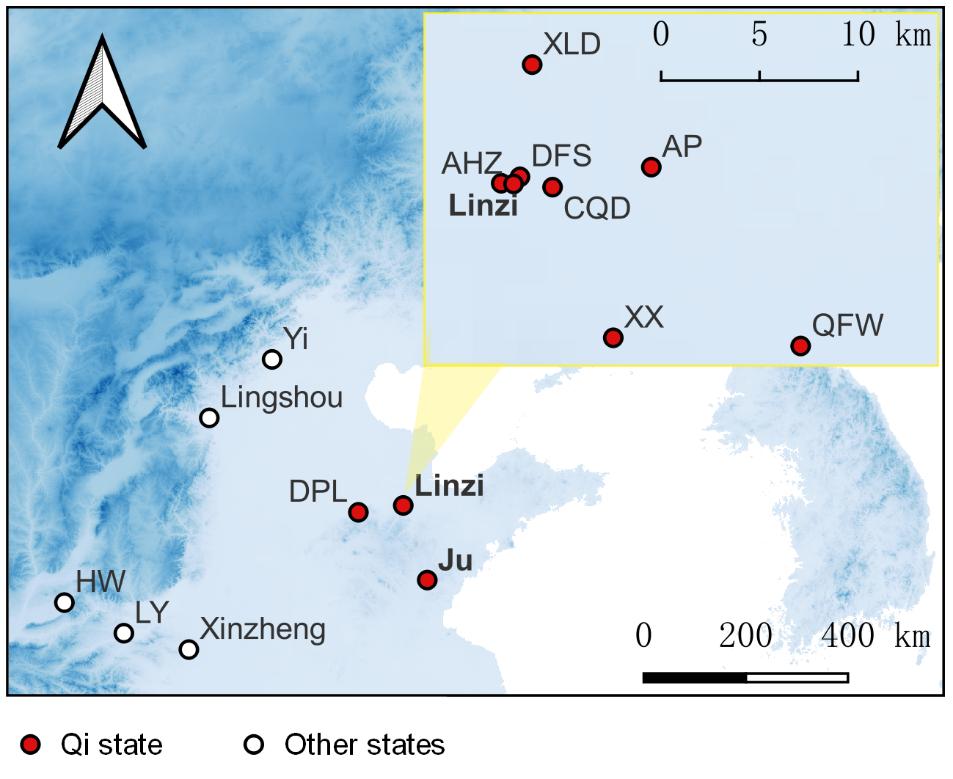 材料分析结果表明,钱范材料主要由砂(极细砂、细砂和少量中砂)组成,而粉砂和粘土含量较少( 图 2 ),钱范的烧成温度超过了1000°C( 图 3 )。与其他类型陶范相比,其材料特征明显不同( 图 4 )。综合细节观察、p-XRF分析和其他考古证据,莒国故城出土钱范很可能存在型腔被刻意磨平后被重新使用的情况(如 图 1 c、d所示)。模拟试验表明,钱范的材料特征使得型腔的刻制非常容易操作。经梳理,含砂钱范不仅在齐国被普遍发现,在易县燕下都、东都洛阳等其他地区也被广泛发现( 图 5 )。由此推断,这一时期,传统的陶范材料已被针对性地大幅改造,具有更好的耐用性和可修复性,以保证钱范可被长期使用。