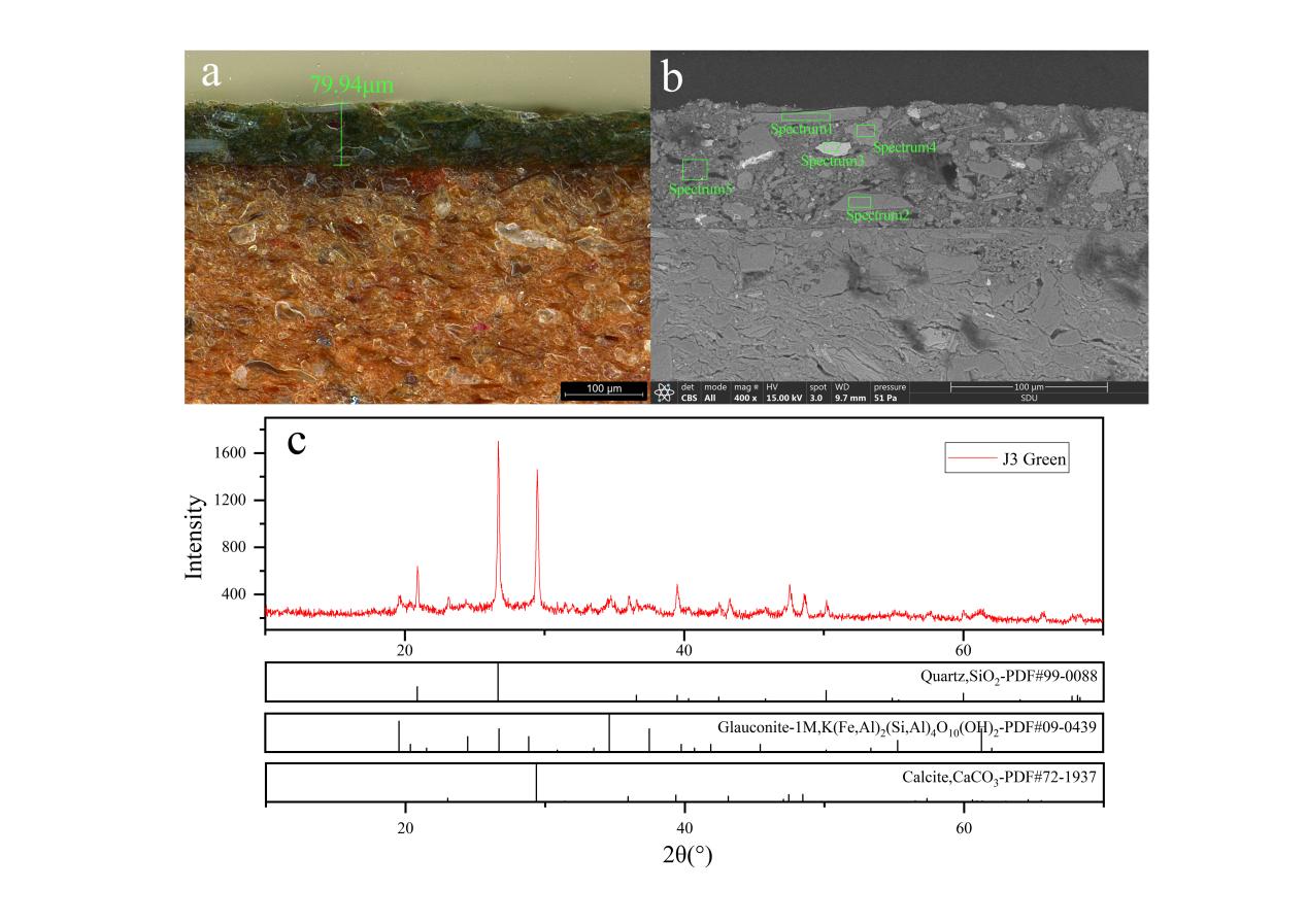 图三 绿色颜料剖面超景深显微照片、扫描电镜照片和XRD谱图