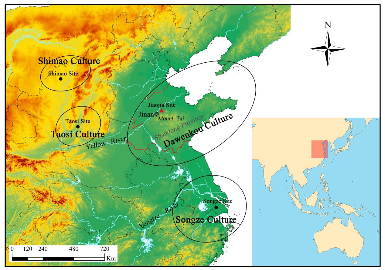 图一 焦家遗址位置及崧泽、大汶口、陶寺、石峁文化区位