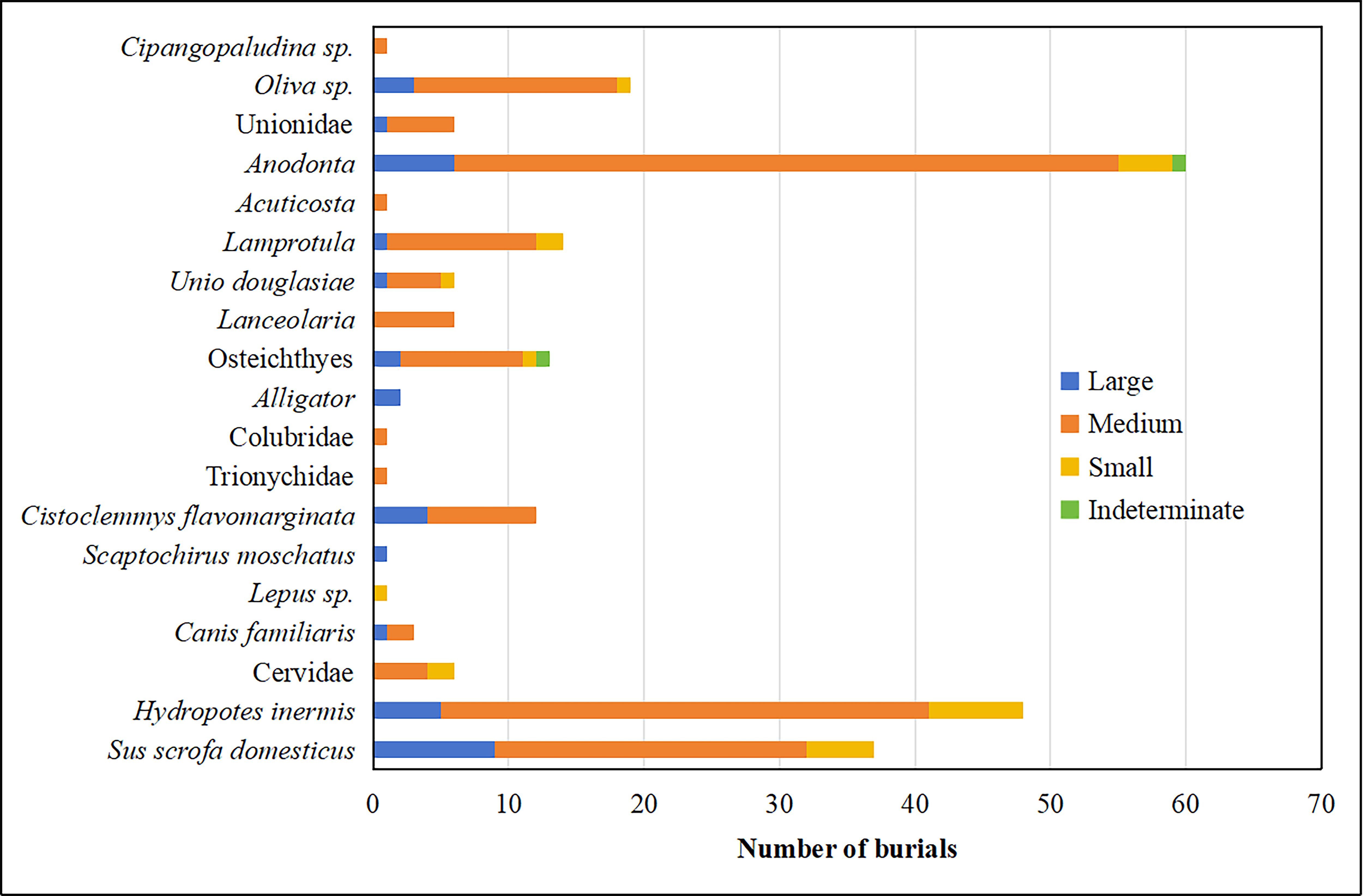 图二 焦家遗址大汶口文化中晚期墓葬随葬动物种属频率分布图