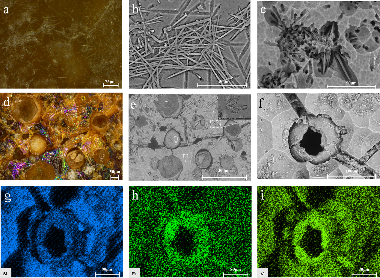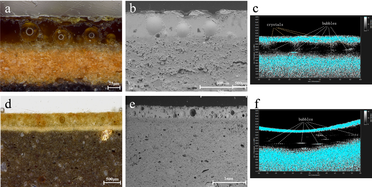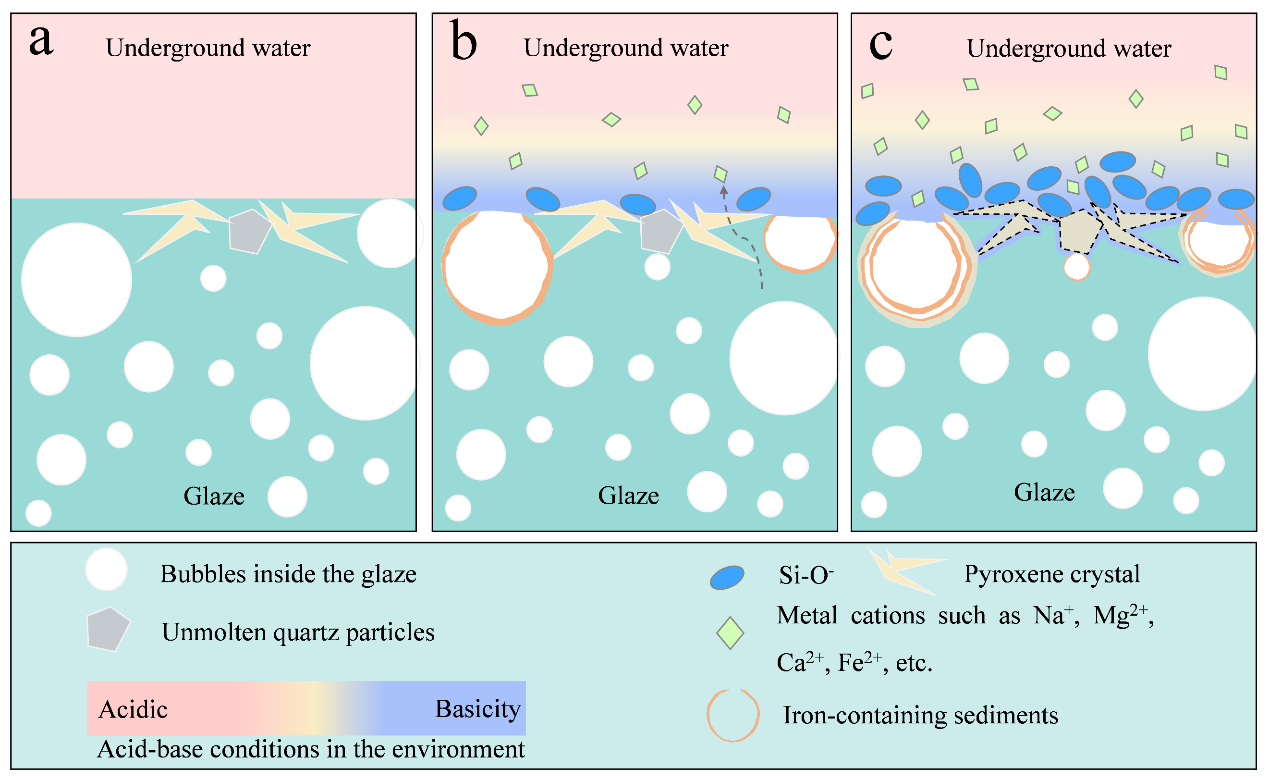 本研究以邛窑十方堂窑址出土八件唐代乳浊釉青瓷为研究对象,通过超景深显微镜、扫描电子显微镜-能谱仪(SEM-EDS)、拉曼光谱和光学相干断层扫描(OCT)技术,系统研究了釉面腐蚀特征、物相成分和埋藏环境协同作用下釉面腐蚀机理。结果表明,釉层腐蚀行为受到原料成分和烧制工艺的显著影响:由于与玻璃相界面的化学稳定性不同,石英颗粒和辉石晶体成为优先腐蚀点位,导致晶体脱落并形成蜂窝状腐蚀坑。腐蚀坑的几何特征(与原始釉层相比比表面积增大)加速了界面离子交换反应,同时为环境中无机胶体提供了沉积通道,从而在气泡坑中形成中空的球形硅酸盐结壳。该研究揭示了邛窑乳浊釉青瓷中晶体相-气泡凹坑-铁质沉积物的多尺度协同腐蚀机理。