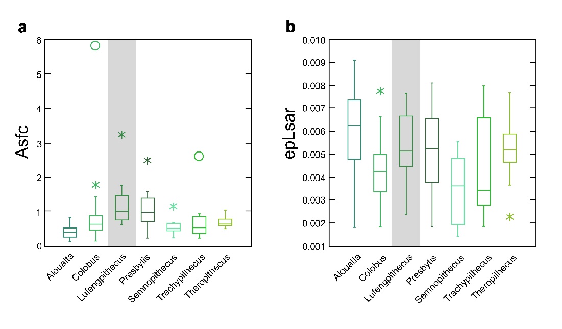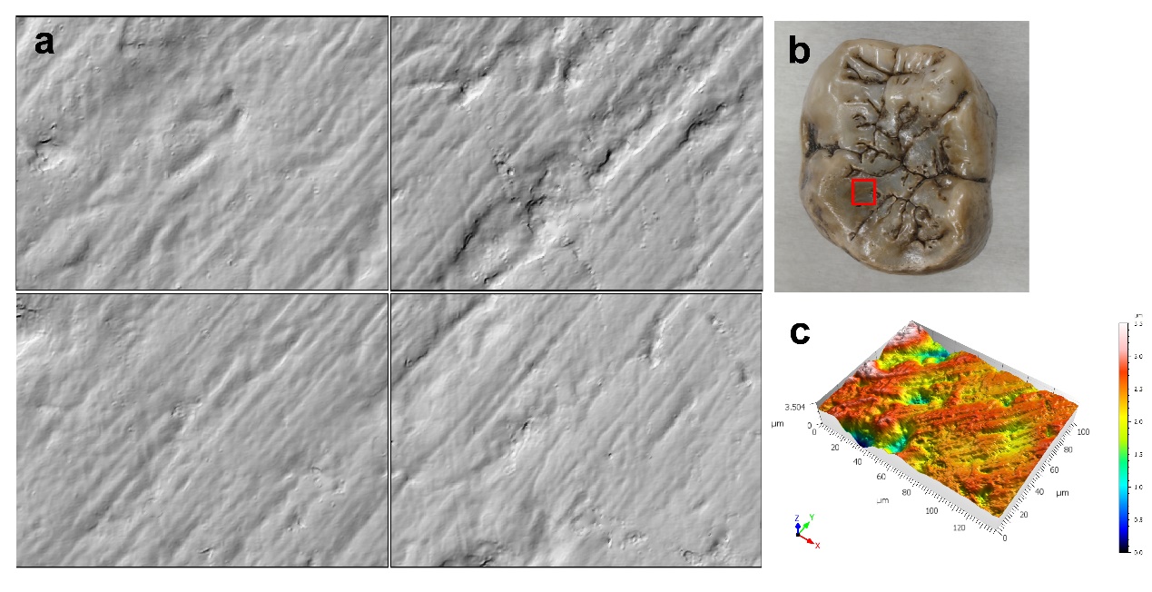 本研究的样品来自中国云南禄丰石灰坝遗址,年代为6.9-6.2百万年前(图1)。选择咬合面保存状况较好的臼齿样本制作高精度模型(n=10),使用白光共聚焦轮廓仪(white-light confocal profilometry)扫描复制品(图2),再利用尺度敏感分形分析软件(scale-sensitive fractal analysis)生成牙齿微磨损纹理的复杂性和各向异性数据。将禄丰古猿的数据与已知食性的现生灵长类物种的微磨损纹理数据进行对比,共分为两个对比组:不同食性基准组(包括食叶、食果、食草和硬质食物消费者)(图3)和韧性食物基准组(食叶为主,不同比例的其他食物)(图4)通过多变量方差分析(MANOVA)、单变量方差分析(ANOVA)和事后检验,比较禄丰古猿与现生灵长类在微磨损纹理上的差异,评估其饮食习性的相似性和差异性。