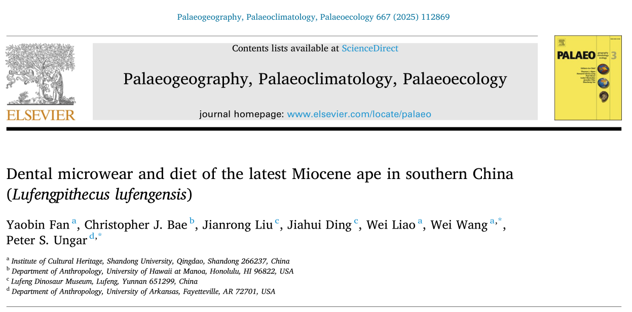 近日,356体育在线官网文化遗产研究院人类演化研究团队在国际学术期刊Palaeogeography, Palaeoclimatology, Palaeoecology 上发表了题为“Dental microwear and diet of the latest Miocene ape in southern China (Lufengpithecus lufengensis)”(中国南方最晚中新世猿类禄丰古猿的牙齿微痕及饮食)的研究论文,首次明确了中新世禄丰古猿的觅食策略。论文第一作者为356体育在线官网文化遗产研究院博士研究生范窅彬,356体育在线官网文化遗产研究院王伟教授和美国阿肯色大学Peter S. Ungar教授为共同通讯。共同作者包括文化遗产研究院廖卫副研究员、美国夏威夷大学Christopher J. Bae教授、禄丰恐龙博物馆刘建荣副研究馆员和丁佳慧馆员。
