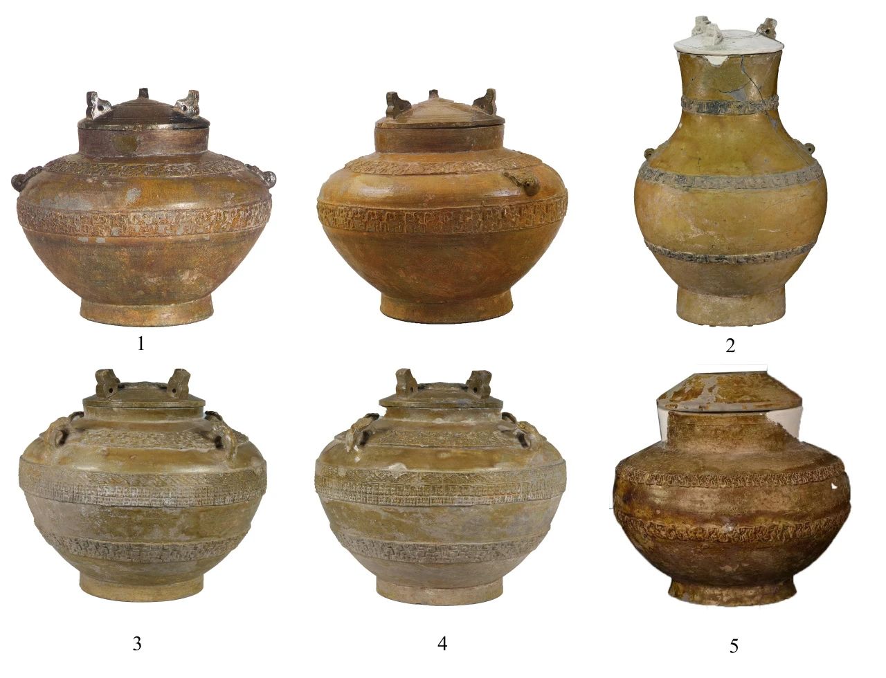 1.绿褐釉蟠螭纹壶(美国纳尔逊美术馆) 2.临淄乙烯M006出土战国低温铅釉陶壶 3、4.临淄安乐店M1出土战国低温铅釉陶罍 5.临淄珑悦三期M1824出土战国低温铅釉陶罍(1-1.后藤茂树编《世界陶磁全集》第8卷,河出書房新社,1955年,彩版7;1-2.谭旦冏主编《中国陶瓷》第1卷,光复书局,1980年,第140页,图80;2.现藏山东省文物考古研究院临淄工作站;3、4.现藏齐文化博物馆;5.现藏临淄区文物考古研究所)