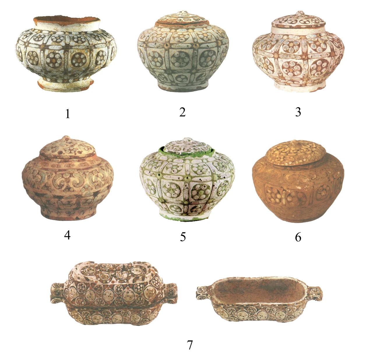 1.战国釉陶罐(大英博物馆) 2.战国铅釉彩陶罐(美国波士顿美术馆) 3.战国铅釉彩陶罐(美国纳尔逊美术馆) 4.战国铅釉彩陶罐(日本东京国立博物馆) 5.彩釉珠纹盖罐(查理士·B.惠特) 6.铅釉彩陶罐(中国浙东越窑青瓷博物馆) 7.战国铅釉彩陶盒(瑞士枚茵堂)(1.Nigel Wood, Chinese Glazes: Their Origins, Chemistry, and Recreation, University of Pennsylvania Press, 2007, p.190 ;2、4、7.谢明良:《中国古代铅釉陶的世界—从战国到唐代》,石头出版股份有限公司,2014年,第16-17页,图1.1、3、4;3.后藤茂树编《世界陶磁全集》第8卷,河出書房新社,1955年,彩版8;5.谭旦冏主编《中国陶瓷》第1卷,光复书局,1980年,第141页,图81;6.陈国桢编著《越窑青瓷精品五百件》上册,西泠印社,2007年,第1页)