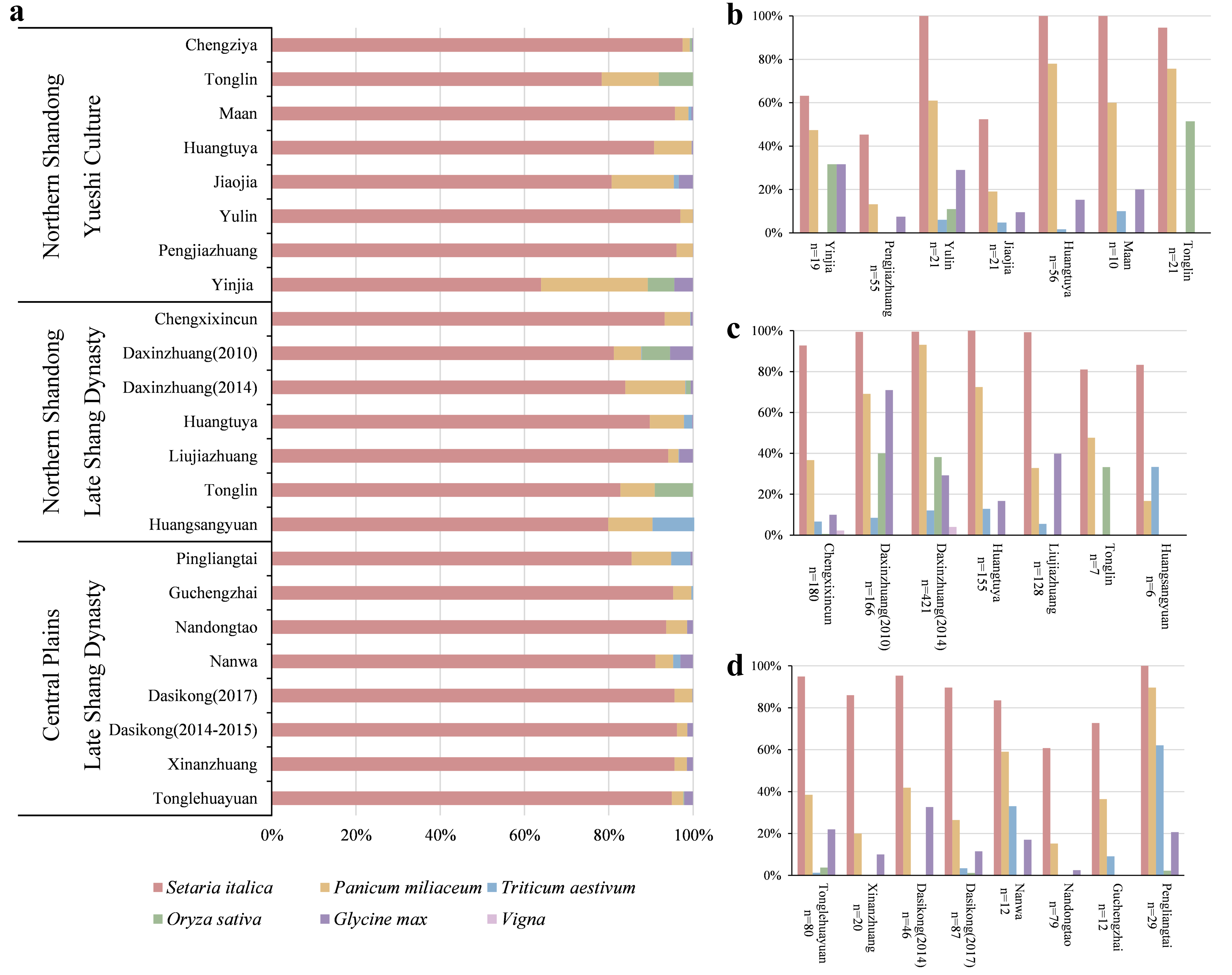 图三 鲁北岳石、晚商时期及中原晚商时期各遗址植物遗存中的农作物相对百分比和出土概率数据:a. 农作物相对百分比; b. 鲁北地区岳石文化时期各遗址农作物出土概率; c. 鲁北地区晚商时期各遗址农作物出土概率; d. 中原地区晚商时期各遗址农作物出土概率