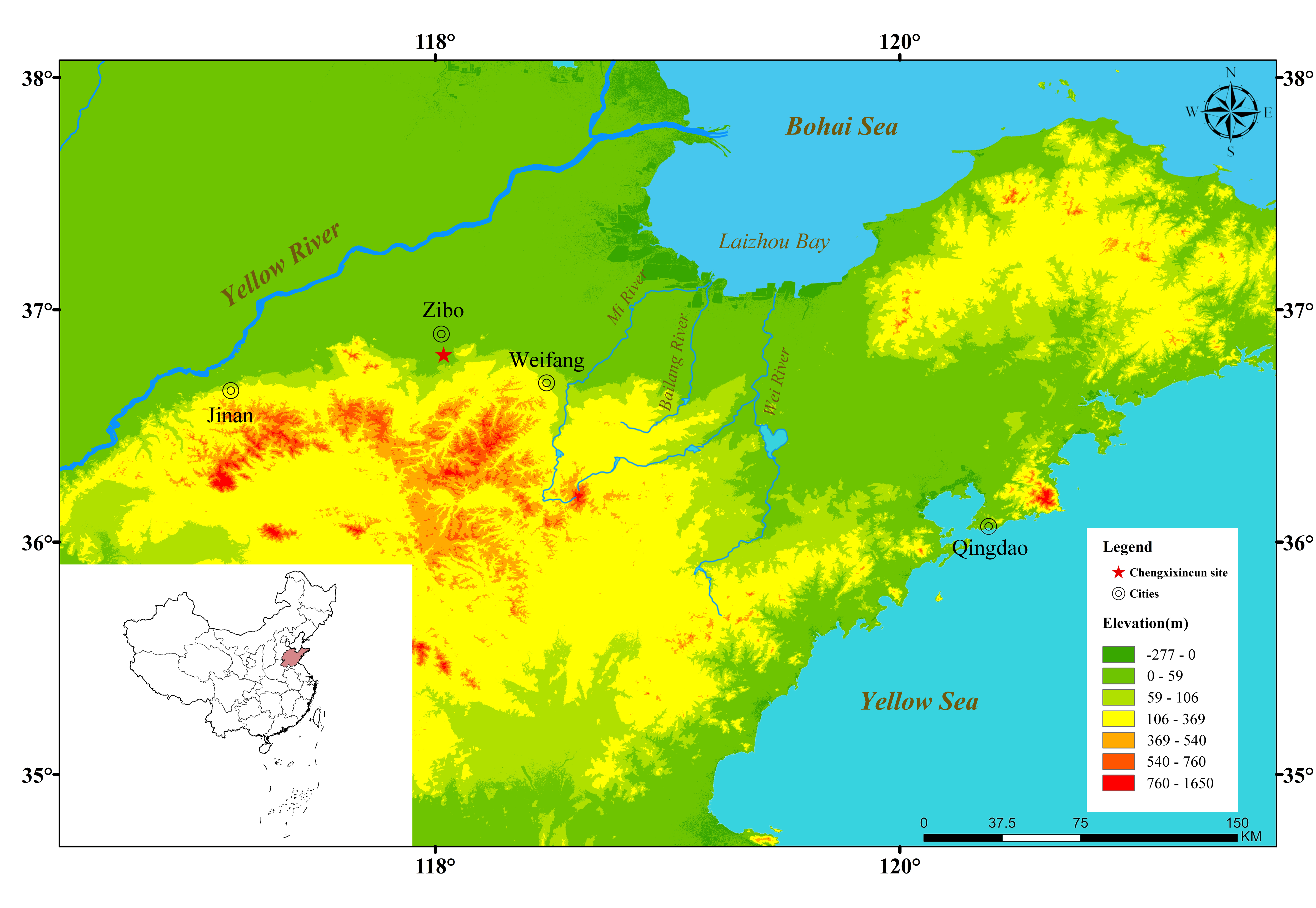 海岱地区在史前时期孕育了大汶口、龙山等繁荣文化,但岳石文化时期社会相对衰落。随着商王朝对山东莱州湾海盐资源的获取和控制,晚商文化在鲁西、鲁北迅速扩张,推动社会复兴。社会发展与人口增长的背后离不开生业经济的繁荣,但截至目前,晚商时期鲁北地区农业结构的特征及其与岳石文化、中原商文化的关系仍不清晰,商文化扩张对农业经济的具体影响亟待探究。因此,研究团队选取了位于山东省淄博市张店区的城西新村遗址(图一)展开AMS14C测年和炭化植物遗存分析,并通过多遗址植物考古数据整合,系统探讨鲁北地区晚商农业结构特征及影响因素。