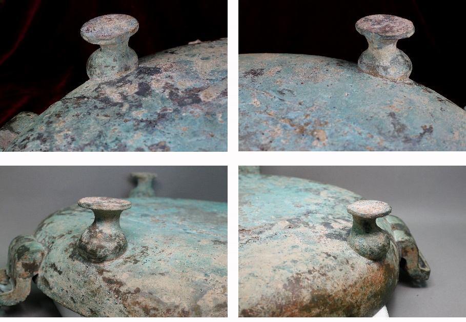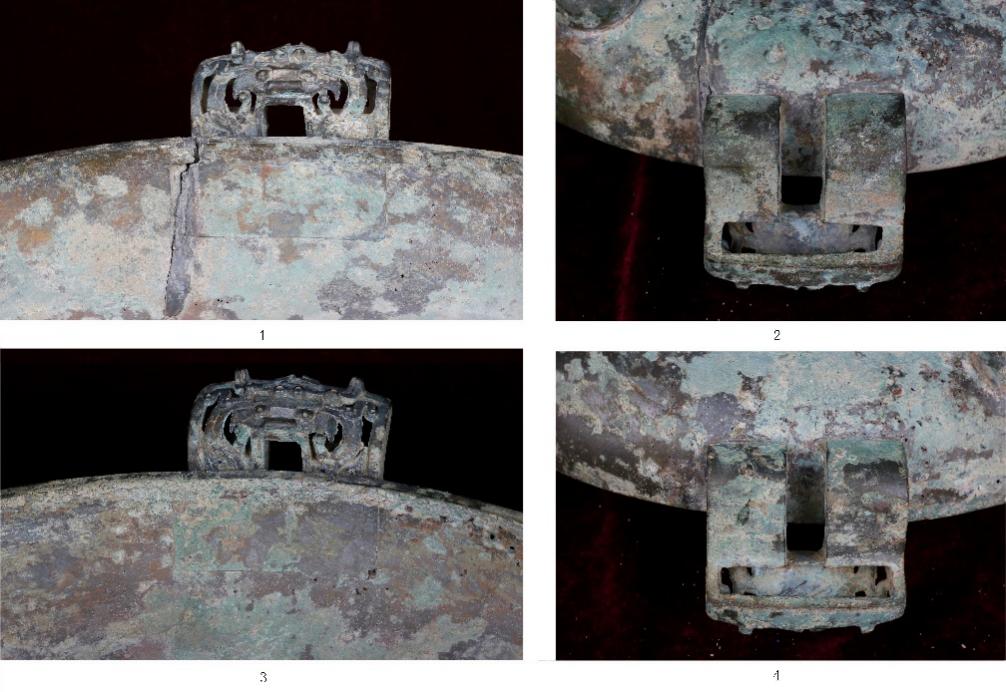 青铜盘双耳的外侧,器耳左右各有一略近方形的分铸孔,边长在0.5厘米左右。内壁与双耳相对位置,各有一边界清晰的长方形分铸痕迹,但青铜盘的外壁并不可见。