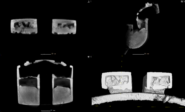 经CT检测发现,该盘盘耳的连接方式为铸焊(焊接),但形式较为特殊:镂空装饰下的平台是密封的,其下还有少部分泥芯,其余空间基本都被金属填充。