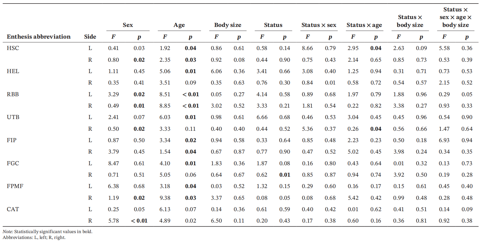 本项研究揭示了焦家遗址中女性群体的上肢骨骼显示出更为的粗壮起止点改变,特别是在肩部和肘部区域。这一现象可能表明她们在日常生活中,例如食品加工、家务劳动以及手工艺制作等领域,承担了较为繁重的任务(见表一)。个体的墓葬等级与劳动强度之间未发现显著的统计学差异,这暗示了焦家遗址社会内部不存在不参与劳动的“特权阶层”(见表二)。这些研究结果为分析中国新石器时代晚期黄淮海流域的劳动分工提供了新的证据,有助于深入理解新石器时代晚期性别与阶层不平等现象加剧的复杂背景。