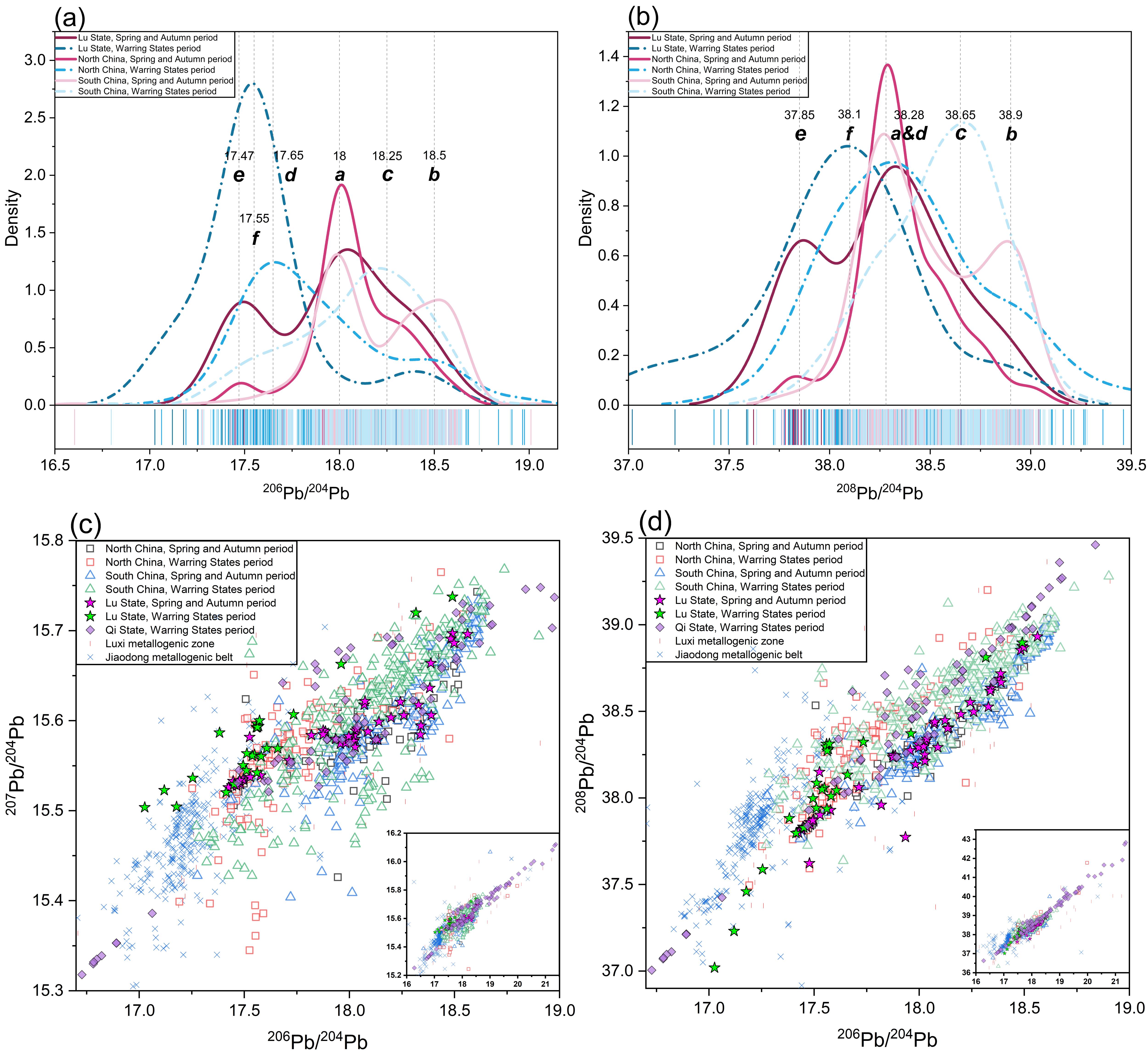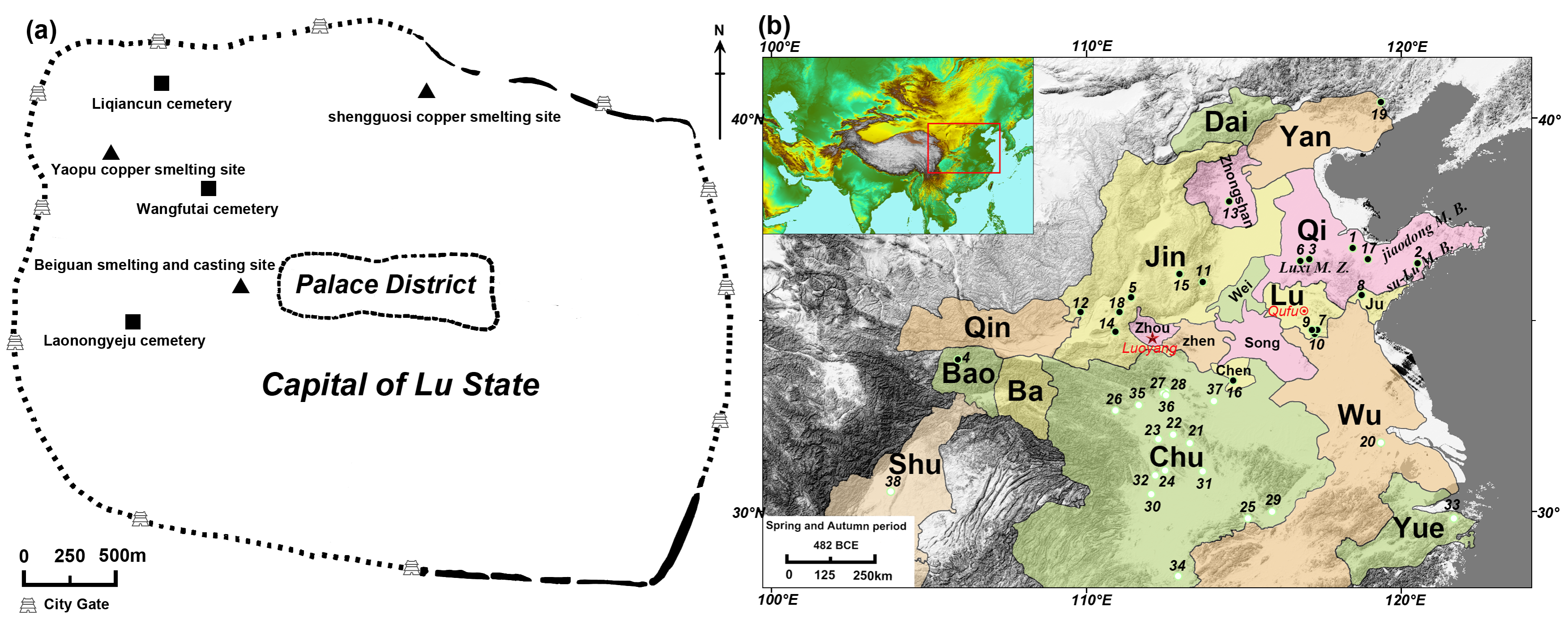 从春秋时期到战国时期,北方的实际封国和南方的名义封国出土铜器在矿料来源上由以北方矿料为主的部分共享模式到南北有别的模式,可能反应了矿料供应模式去中心化的过程,而这一过程可能是“天下无道,则礼乐征伐自诸侯出”的礼崩乐坏历史进程的直接结果。春秋时期,鲁国青铜器的铅同位素组成变化趋势与北方封国基本同步。至战国早中期,鲁国所在的山东本地矿山可能得到了利用。到目前为止,曲阜尚未发现与齐国一样主要来自于鲁西成矿带的高放射性成因铅铜器,因此其矿料来源更可能来自于富含低比值铅的胶东成矿带。