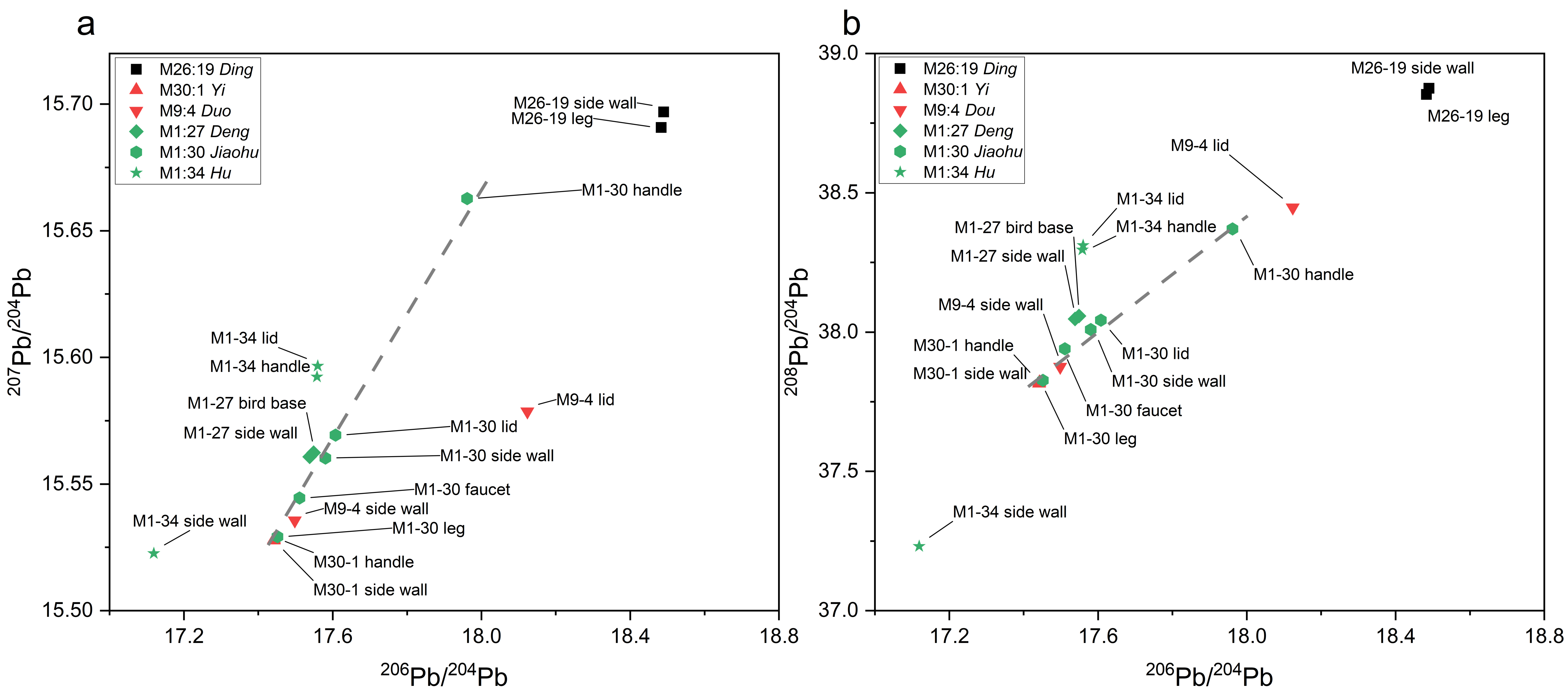 本研究从铅同位素比值分析的角度,初步探讨了浑铸和分铸工艺在鲁国铜容器上的应用,证明了铅同位素比值法在复原古代青铜器铸造工艺方面的潜力。此外,在女性墓M1中存在三件成套的铜壶,其形制上仅见于齐国的墓葬中,铅同位素比值分析表明其采用的是齐国的矿料,推测墓主人可能来自于齐国。在同一时期周人墓葬和土著夷人/灭国的商人墓葬出土铜器的铅同位素比值存在较明显的差异,体现出两组人群在社会政治经济地位中的差别。