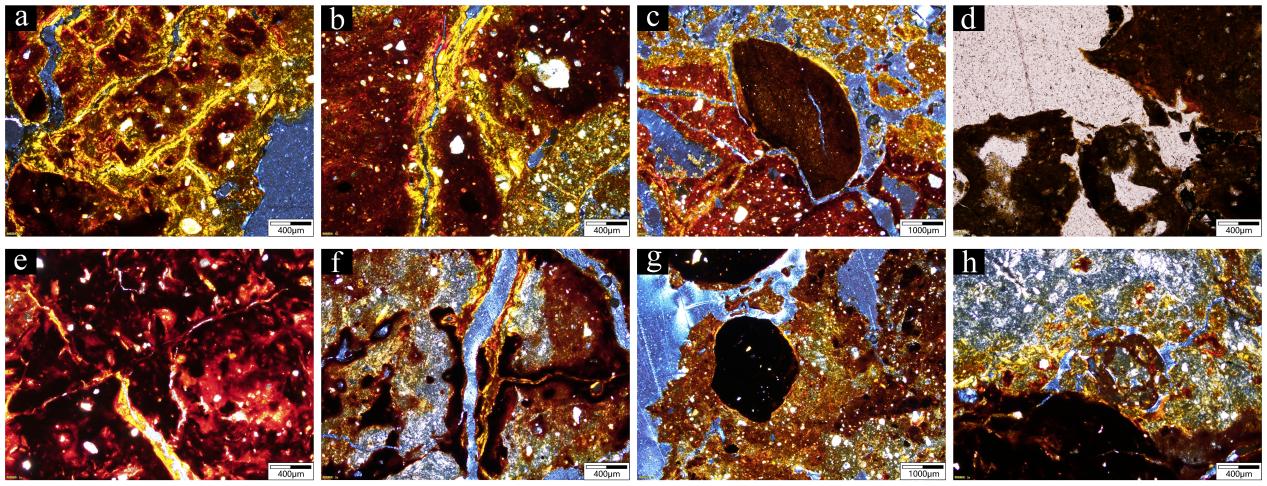 图4.土壤微形态切片(来自高岭坡和枫树岛遗址的网纹红土层)