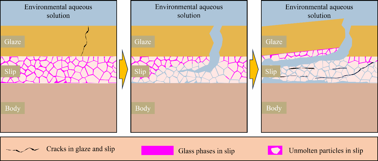 研究表明,釉陶内部化妆土中玻璃态物质溶解腐蚀是釉层脱落的主要原因之一。此外,釉陶内部腐蚀过程并非单向劣化过程,玻璃态物质与未熔融石英等溶解生成的硅酸盐物质可作为粘结剂,能够加固釉陶内部多孔结构(如烧结程度较低化妆土和胎体),从而增强其对水盐侵蚀的抵抗力。当某些区域劣化作用弱于加固作用时,釉层附着能力会相对增强。硅酸盐物质在自然埋藏环境下会显著减缓釉陶内部多孔结构劣化进程。