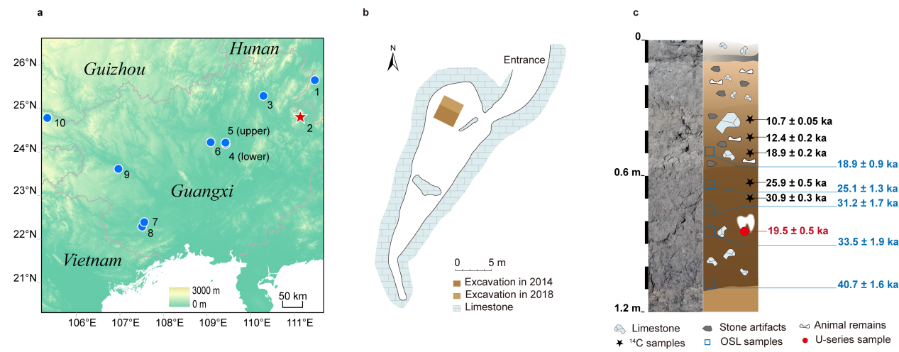 图一 (a) 尖山遗址(红色)及部分晚更新世古人类遗址(蓝色)分布;(b)尖山洞平面图;(c)尖山遗址地层剖面图。