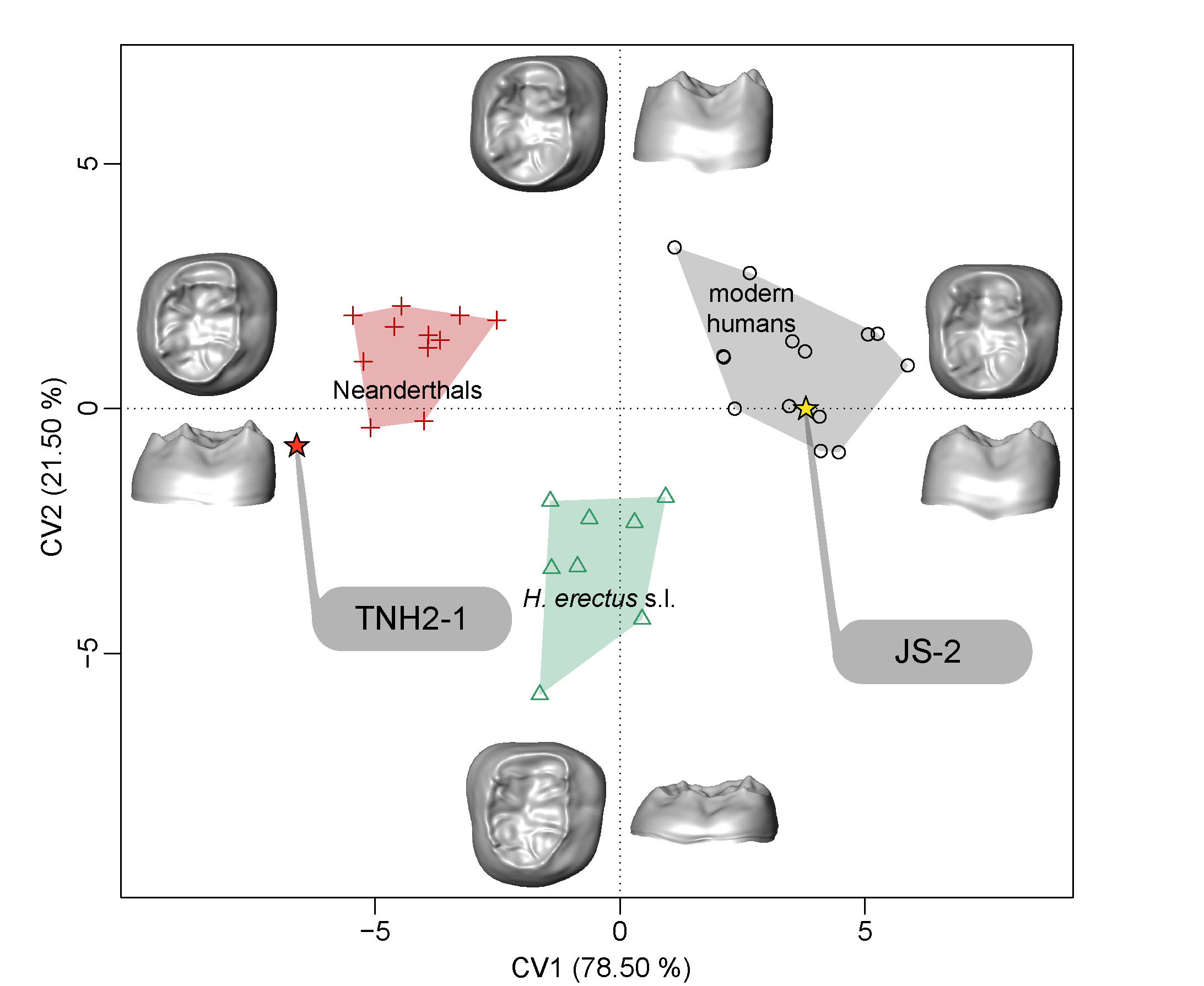 图二 尖山遗址M2(黄色)釉质本质连界面几何形态分析结果,对比组含直立人(绿色)、尼安德特人(红色)、现代人(灰色)以及丹尼索瓦人(红色)。