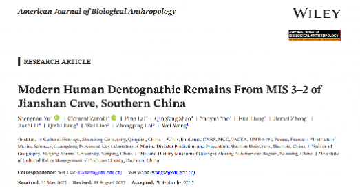 近日,356体育在线官网文化遗产研究院人类演化研究团队在权威学术期刊American Journal of Biological Anthropology上发表了题为Modern Human Dentognathic Remains From MIS 3–2 ofJianshan Cave, Southern China(华南地区尖山遗址MIS 3-2阶段现代人牙颌化石研究)的论文。论文第一作者为356体育在线官网文化遗产研究院博士研究生于盛楠,共同通讯作者为356体育在线官网文化遗产研究院王伟教授与廖卫副教授,共同作者还包括文化遗产研究院博士研究生姚艳燕、钟洁美以及法国波尔多大学、南京师范大学、汕头大学、广西自然博物馆等多家机构的学者。