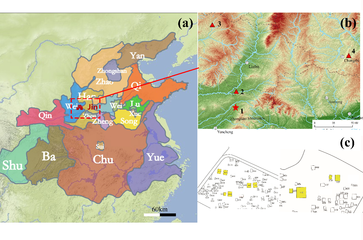 图1 邱家庄墓地的地理位置;(a)战国早期的诸侯国分布;(b) 本研究所涉及的遗址;1.邱家庄墓地;2.侯马铸铜遗址;3.瓦窑坡墓地;4.分水岭墓地;(c)邱家庄墓地的墓葬分布;黄色标出的为本研究所涉及的墓葬