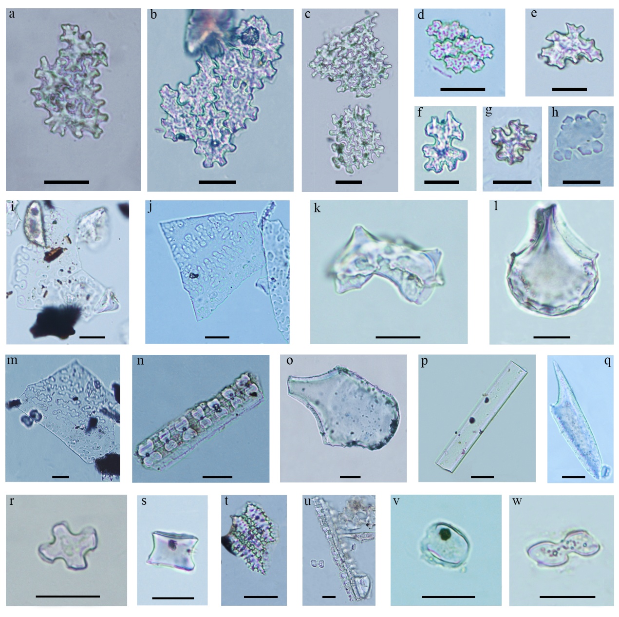 a-d. 大麻不规则多边疣粒板型(聚合形态);e-g. 大麻不规则多边疣粒板型(单体形态); h. 大麻不规则多边平滑板型(单体形态);i. 粟稃壳Ω型;j. 黍稃壳η型;k. 稻壳双峰型;l. 稻叶扇型;m. 稗β型;n. 横排哑铃型;o. 芦苇扇型;p. 平滑棒型;q. 尖型;r. 十字型;s. 帽型;t. 具刺纺锤型;u. 竖排哑铃型;v. 鞍型;w. 哑铃型;比例尺为10μm