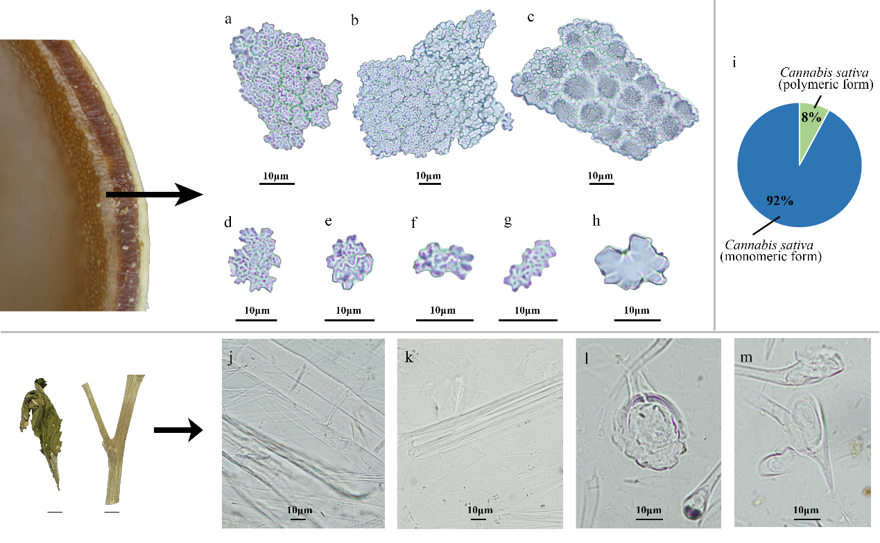 a-c.双层嵌套板型正面观;d-e. 不规则多边疣粒板型正面观(聚合形态);f-g.不规则多边疣粒板型正面观(单体形态);h. 不规则多边平滑板型正面观;I. 不规则多边疣粒板型侧面观; j. 不规则多边板型单体与聚合形态的比例;k-l.来自大麻茎秆的硅化纤维细胞;m-n. 来自大麻叶片的硅化毛细胞及其基部;比例尺为10μm