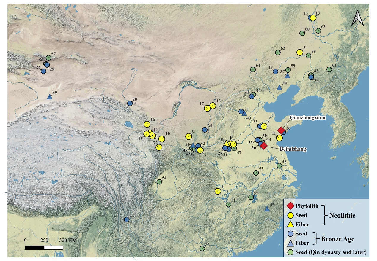 图一 中国新石器时代至历史时期(8000-500 BP)大麻遗存的分布