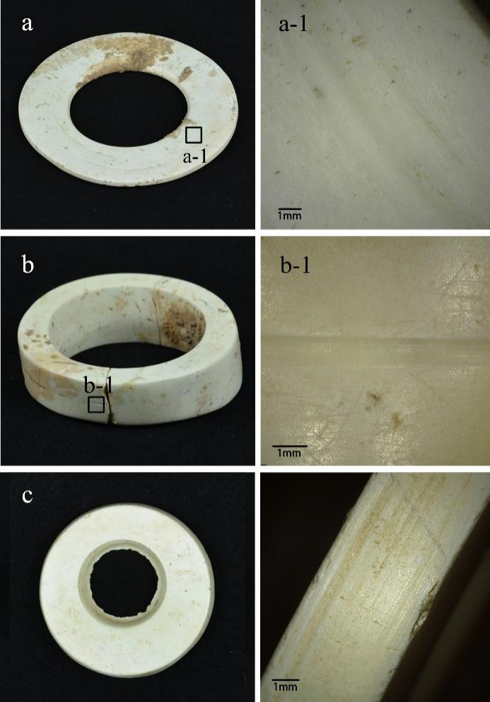 a (M166:4)环; a-1 M166:4表面线切割痕 ;b (M179:5)环 b-1 M179:9表面切割痕; c (M197:7)环及侧面管钻螺旋痕