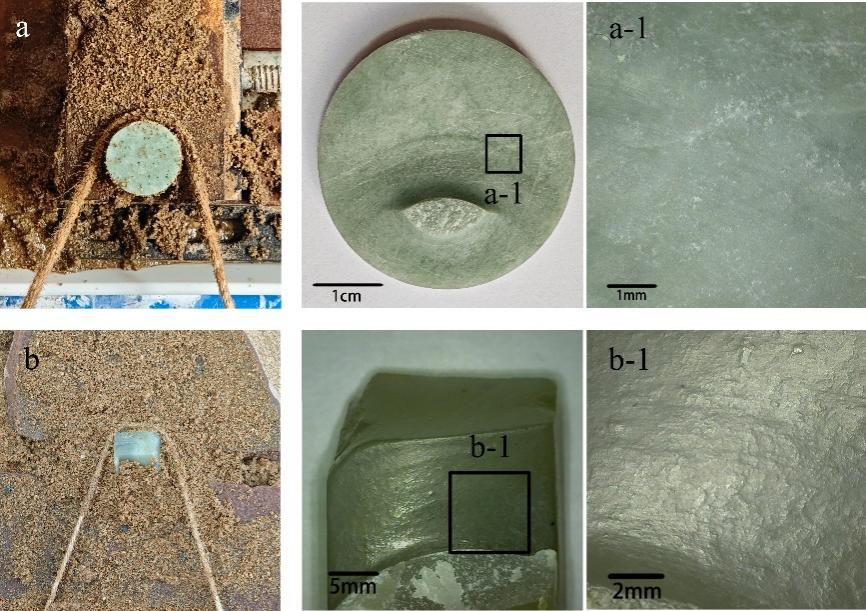 线切割模拟实验显示,线切割会形成起伏的切割面以及抛物线形的凹槽或凸起。这些痕迹是判断线切割工艺的重要特征。玉料的形状也会对切割痕产生一定的影响。切割圆柱形玉料时,切割产生的抛物线形切割痕的对称轴通常经过会切割面的圆心。在抛光模拟实验中,不同的抛光方式会产生不同的痕迹。皮革、大麻皮直接或配合较细解玉砂均有较好的抛光效果,并产生形态不同的抛光面和抛光痕。