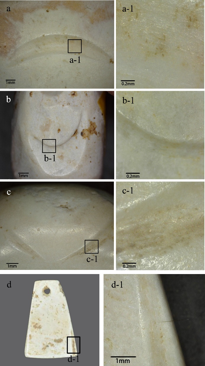 a (M172:11)环 ;a-1 M172:11线切割微痕 ;b (M164:1)耳坠; b-1 M164:1线切割微痕; c (M198:5)镯; c-1 M198:5线切割微痕; d ( M211:25)坠 ;d-1 M211:25片切割微痕