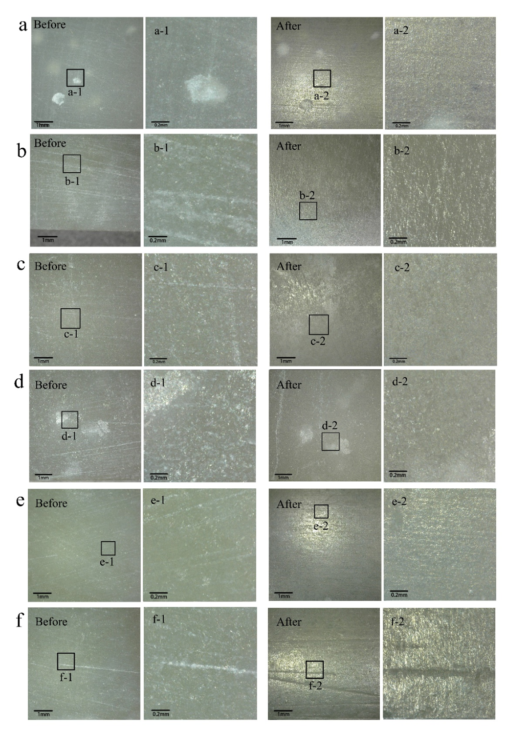 a 皮革抛光 ;b 皮革夹砂抛光; c 砺石抛光; d 砺石夹砂抛光; e 植物抛光; f 植物夹砂抛光