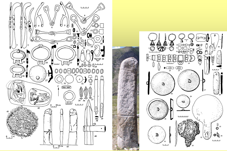 迈耶米尔文化主要分布在比肯文化的西、南部,即今哈萨克斯坦境内。其墓葬出土了大量随葬品,包括金属马衔等车马器、背面装饰有大角鹿的铜镜以及保存完好的缰绳等。鹿石文化主要分布在比肯文化的东、南部,其墓葬被盗掘严重,出土遗物主要为“鹿石”。提什金教授对中俄蒙地区鹿石的发现和象征意义进行了详尽的解释,并认为鹿石这一文化遗存的使用可能是游牧民族帝国典型的文化象征。