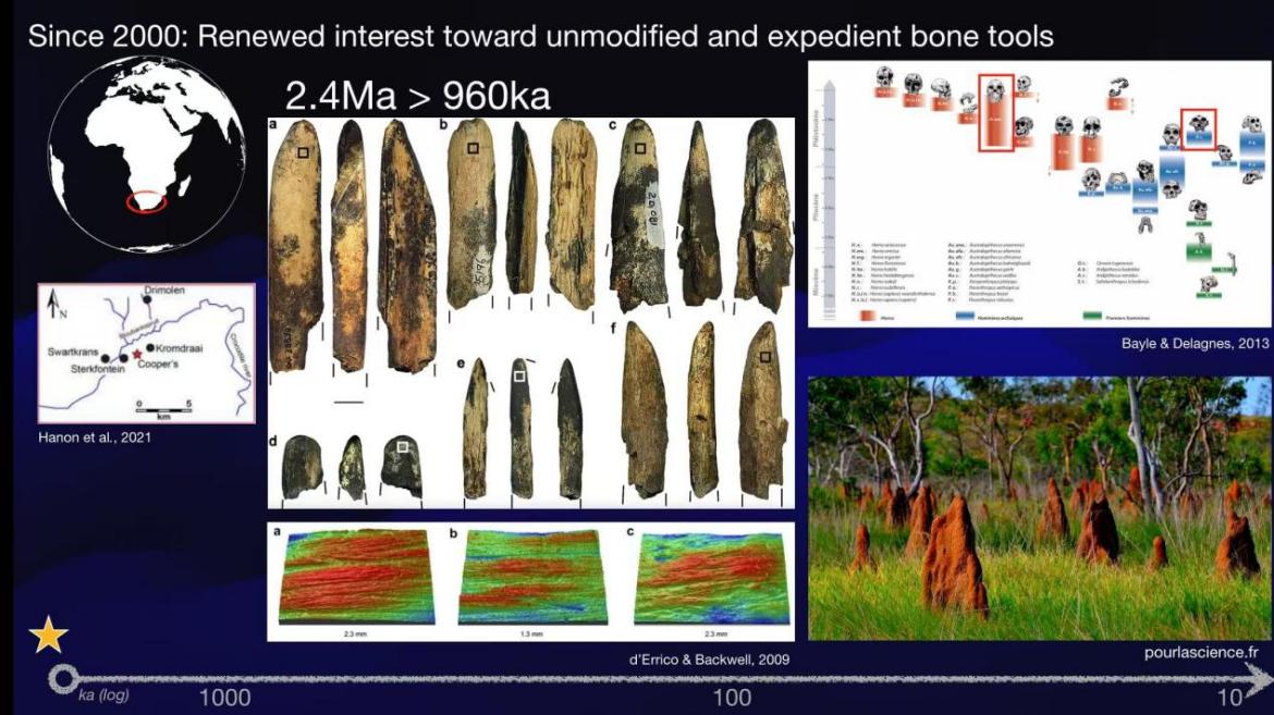 权宜骨器 :自2000年以来, 学界重新兴起了对权 宜骨器的研究。目前最早的权宜骨器发现于南非, 年代为 距今240万年, 极 可能是直立人或傍人制成的。这些工具形制简单, 应为 就地取材, 学者们根据表面痕迹推测其 主要用于挖掘白蚁丘, 并在使用后 被带回洞穴长期使用。 这 表明傍人已 存在获取骨质资源、白蚁 的认知能力, 并有保存骨器和传承技术的意识。