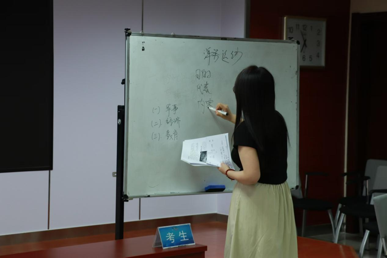 5月23日晚,面试以模拟应聘“S大学附属中学历史教师”为主题,各位考生依次进行“洋务运动”课程的试讲。考生以生动有趣的教学方式、深入浅出的教学内容、独特新颖的教学设计,展示了自身教学能力和创新潜力。两位评委根据参赛选手的试讲内容、教学方法和课堂互动等方面进行现场点评和指导,提出了一系列意见和建议,帮助参赛考生进一步完善教学能力和说课形式。