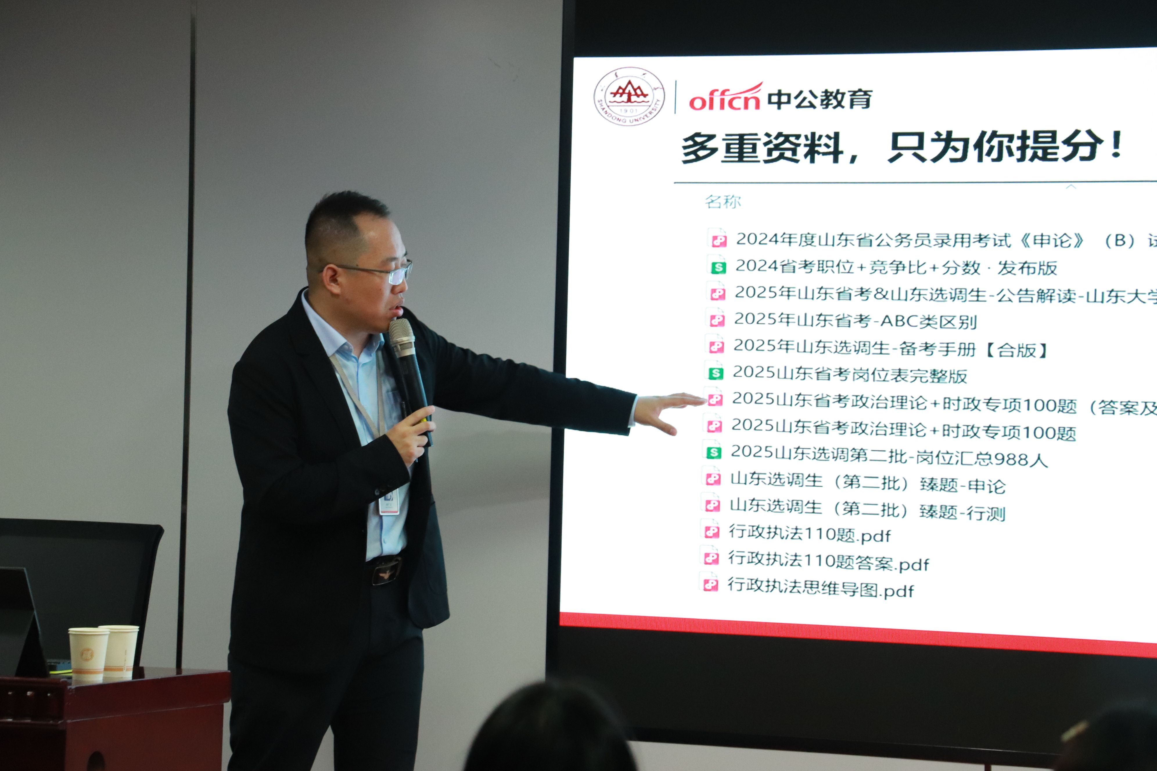 为增进同学们对山东省公务员考试及选调生考试政策的了解,解决同学们备考过程中的疑惑,356体育在线官网于11月13日在中心校区知新楼A1017举办了2025年度山东省公务员考试及选调生考试公告解读会。本次活动邀请中公教育资深讲师郝广义老师作为主讲嘉宾,致力于为同学提供公务员考试的最新动态,帮助同学规划高效的备考复习策略。