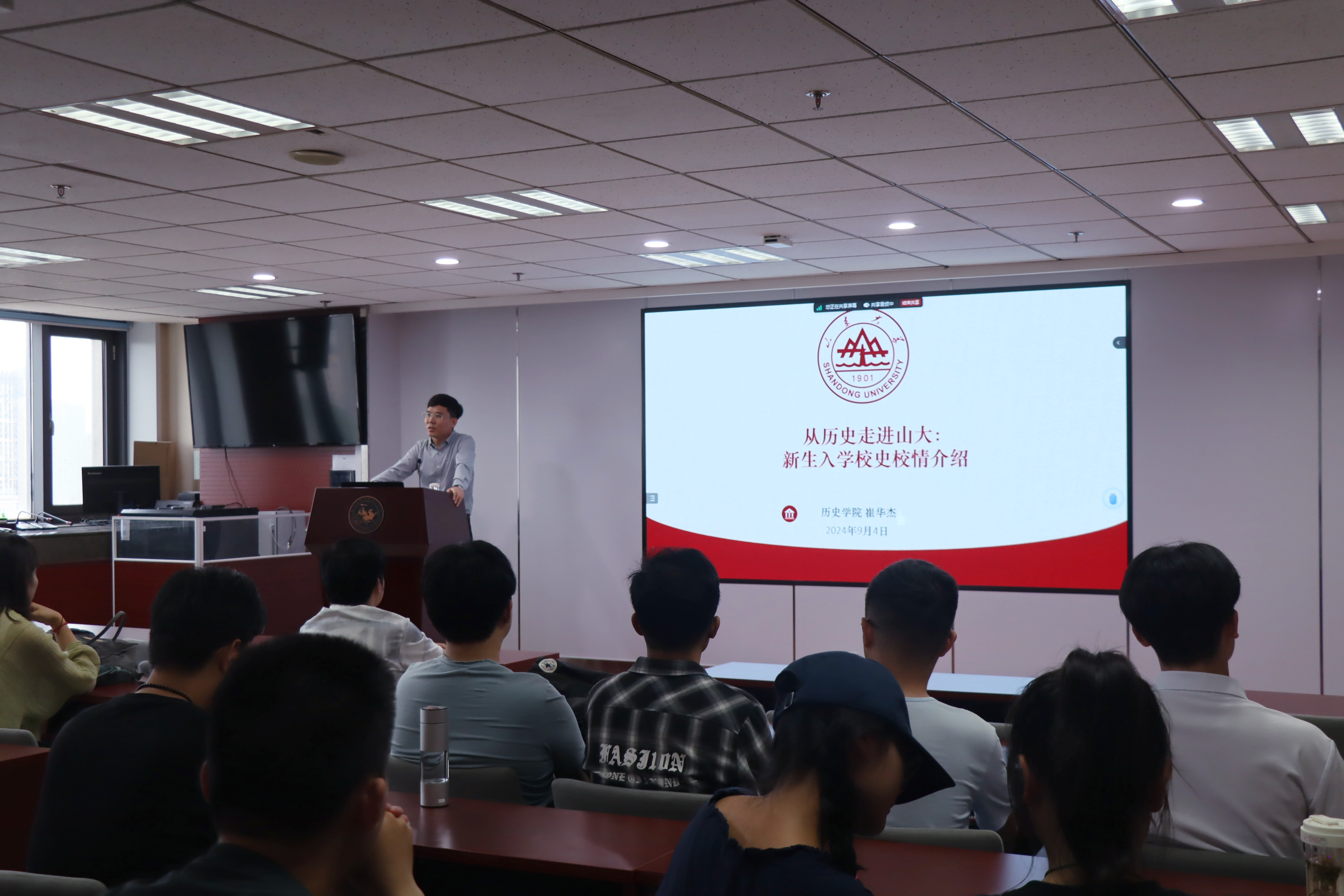 9月5日14点30分至16点,新生校史校情教育讲座在知新楼A1017举行。崔华杰教授进行了主题为“从历史走进山大”的讲座,以生动有趣的讲解方式介绍了356体育在线官网建校123年的悠久历史、历届优秀教师以及知名员工等,增强了研究生新生对学校发展历程的了解程度和自豪感。讲座最后,崔华杰引用习近平总书记对青年人的嘱托语录,以此寄语2024级研究生同学,希望同学们能努力奋斗、积极进取,在伟大时代中有所建树。本次教育帮助新生更好地理解了学校的办学宗旨、校训校风,激励新生在接下来的研究生生涯努力弘扬山大精神,争做新时代的优秀山大学子。