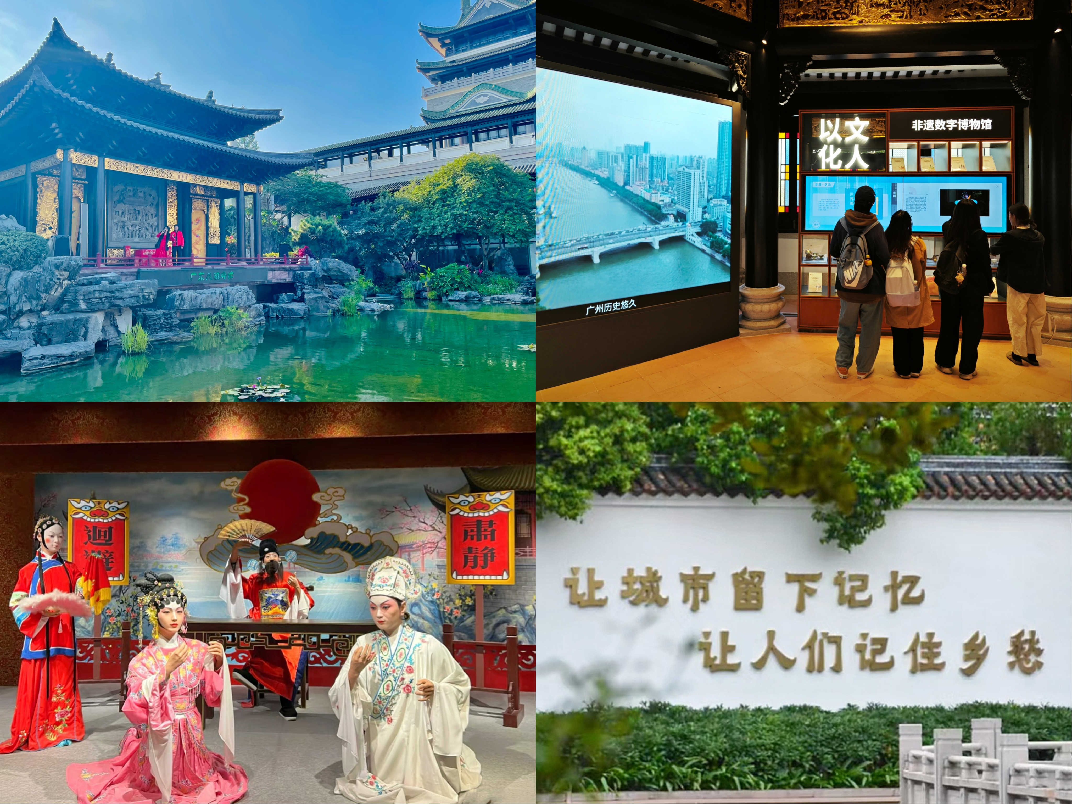 探寻文化根脉,传承非遗瑰宝。师生们走进粤剧艺术博物馆,一入馆便被充满岭南水乡特色的传统园林景致所吸引,隔水相望的广福戏台上,精彩粤剧正在展演。同学们沉浸其中,领略了粤剧博采众长、兼收并蓄的独特文化魅力。在永庆坊,銮舆堂、宝庆大押等历史建筑,手工印章雕刻、西关打铜等非遗展示,无不令同学们感受到“绣花”功夫促进文明传承与文化延续的用心、用情。2018年10月,习近平总书记在此考察时强调,“让城市留下记忆,让人们记住乡愁”。