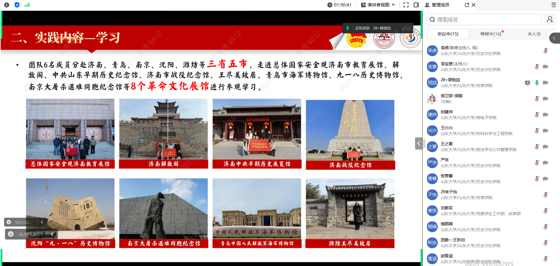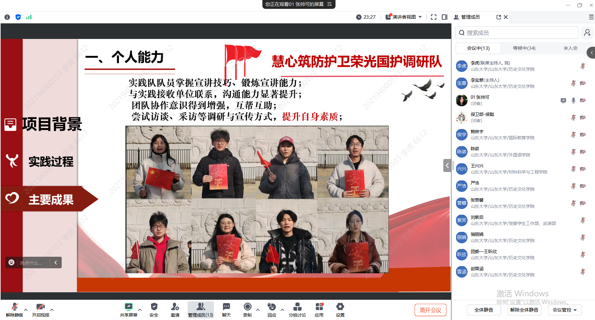 活动中,来自一校三地不同学院、专业的负责同学通过线上平台依次展示了实践过程、实践成果、实践展望等内容。他们完成问卷调查、开展访谈和走访调研,查阅海量资料、深入各地多个育人场馆、组织多形式宣讲,聚焦国家安全专题,深刻阐述国家安全的重要性,深入挖掘开展国家安全教育对当代老员工成长发展的重要意义。