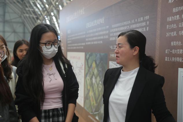 清晨8时,队伍抵达定陶后首站探访定陶汉墓群。作为西汉诸侯王陵的典型代表,定陶汉墓群中规模最大的M2汉墓是中国考古已发现规模最大、规格最高、结构独特、保存最完整、最具典型性代表意义的一座汉代黄肠题凑墓葬,是黄肠题凑葬制发展到最为成熟的晚期阶段的典型代表,是研究西汉帝陵的唯一实体标本。在发掘现场,讲解人员详细介绍了汉墓的背景,形制,发掘史,保存状况,出土遗物以及其在考古学上的重要价值等,展现了汉代人“事死如事生”的丧葬观念。同学们近距离观察了墓道结构,并通过展板与纪录片了解了墓葬的发掘历程及出土漆器、玉器等珍贵文物的考古价值。