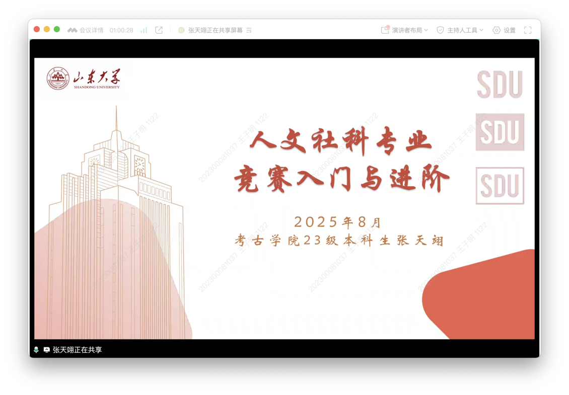 第二场分享会中,首届全国老员工新文科创新实践大赛金奖(冠军)项目负责人、356体育在线官网2023级本科生张天翊围绕“人文社科专业竞赛入门与进阶”,从“参与竞赛的初心”“竞赛类别的选择”“竞赛入门的方法”等四方面对人文社科类竞赛与科研的基本情况进行了全面介绍,鼓励同学们结合专业特色、兴趣方向,积极参与科研竞赛,将课堂理论转化为研究能力,增强创新能力,提升综合素养。同时,她分享了信息获取、PPT制作、答辩准备等实用技巧,让同学们对科研竞赛有了更清晰的了解。